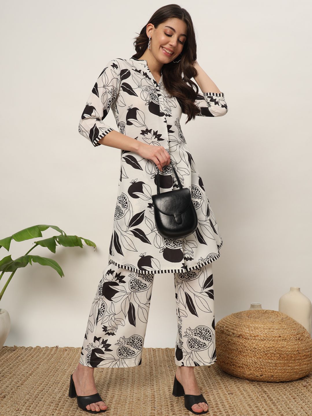 Embrace the timeless grace with this off white leaf print co-ord set by MIAOW . crafted from cotton blend fabric, it features 3/4th sleeve, spread collar. pair it with ethnic jewelry and sandals to complete your ensemble. Top Material : Cotton Blend || Palazzo Material : Cotton Blend Package contain: Top || Palazzo Pattern : Leaf Print || Neck Type : Mandarin Collar || Sleeve Type : 3/4th Sleeve
