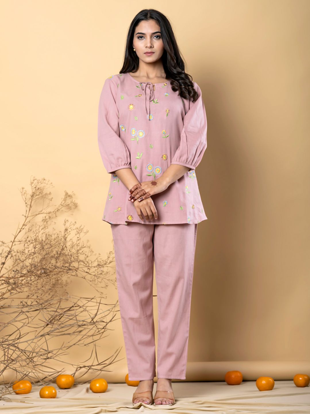 Women Curved Style Cotton Flex Fabric Mauve Color Resham,Embroidered Tunic And Bottom