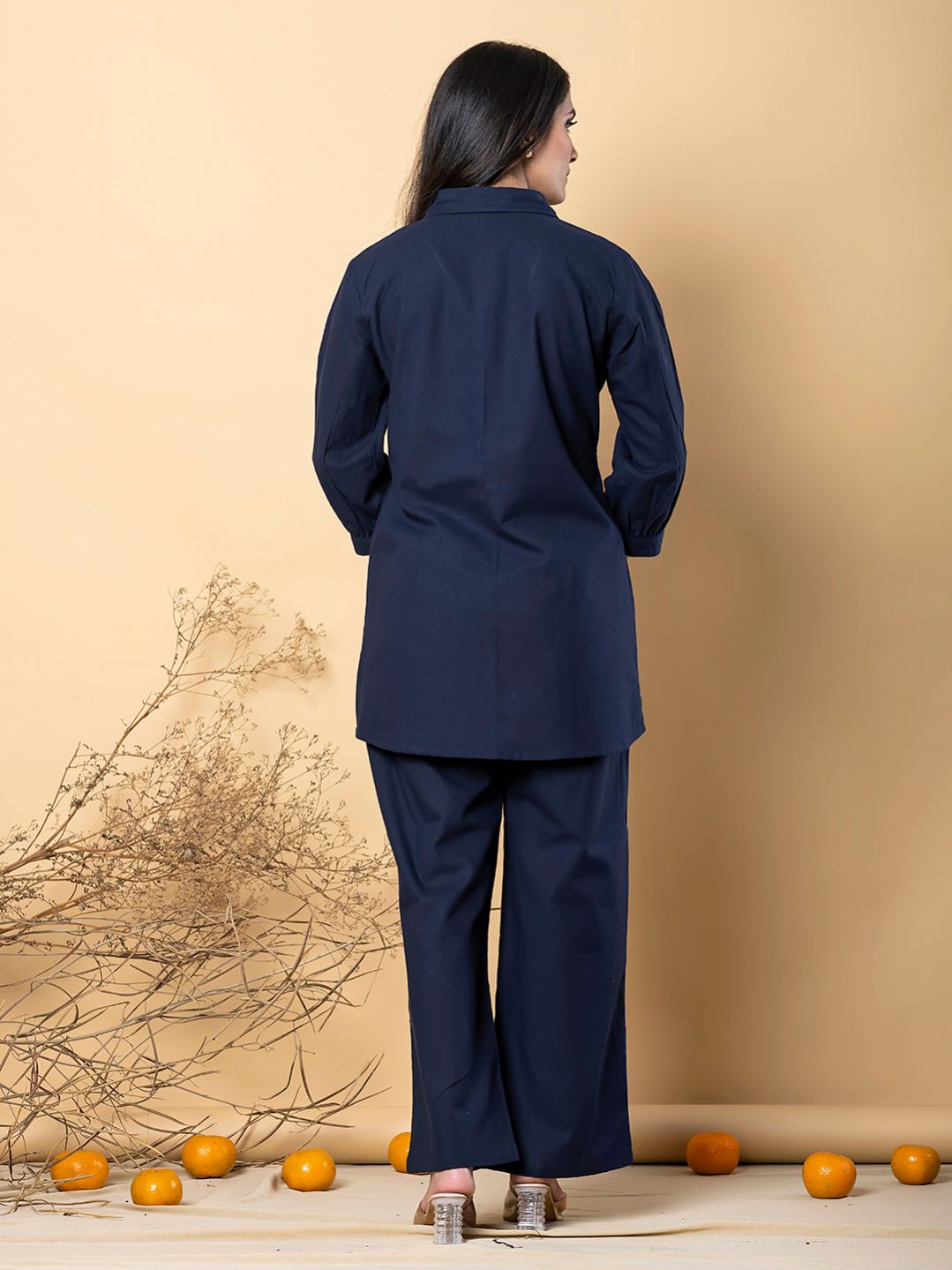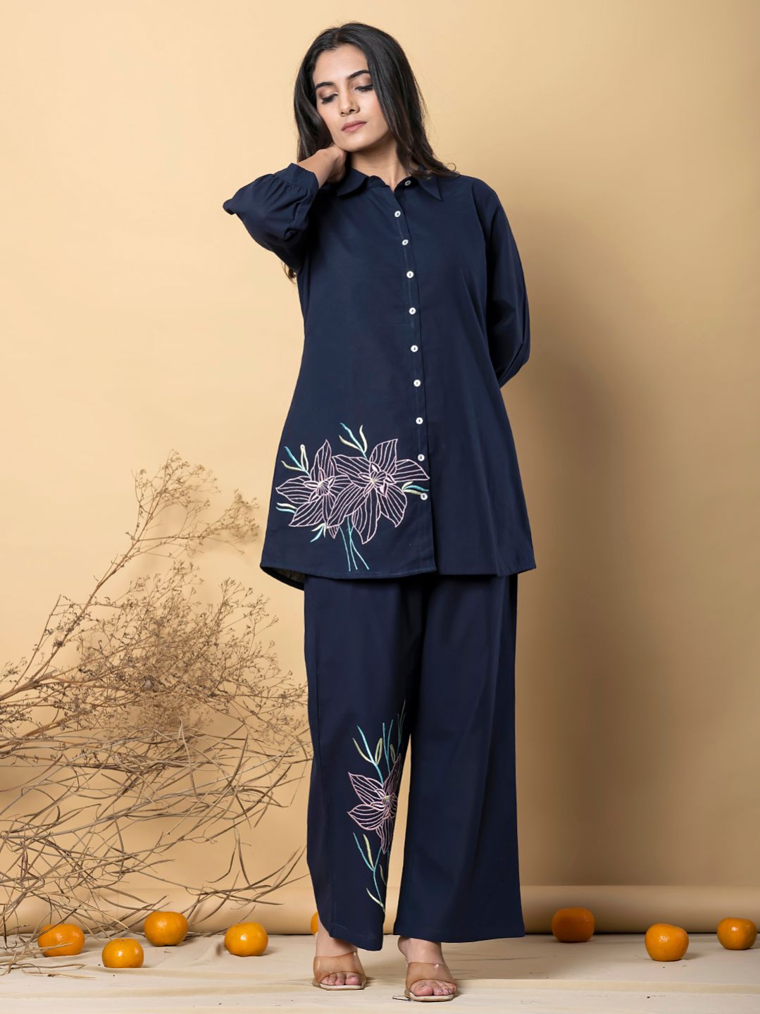 Women Curved Style Cotton Flex Fabric Navy Blue Color Resham,Embroidered Tunic And Bottom