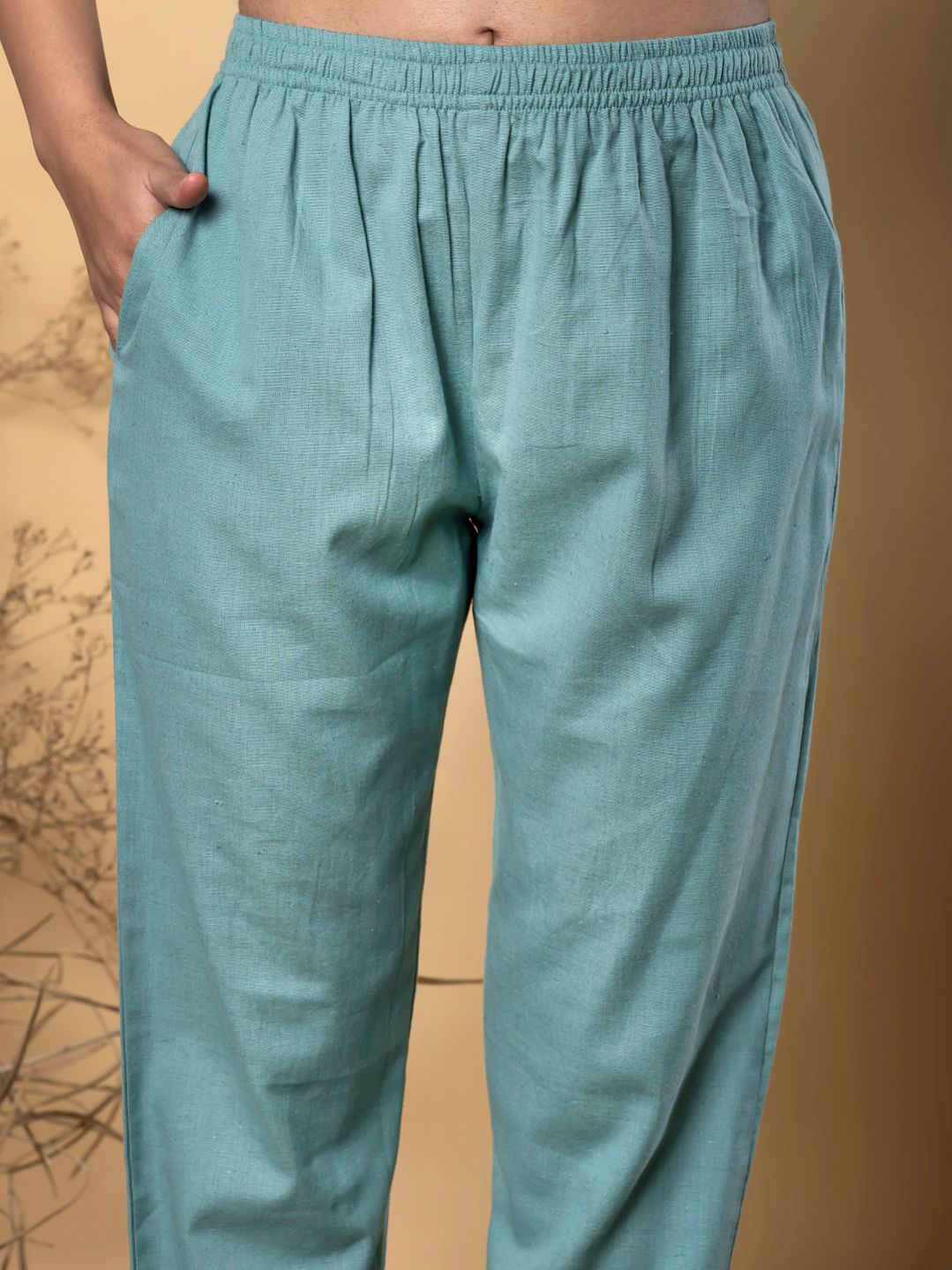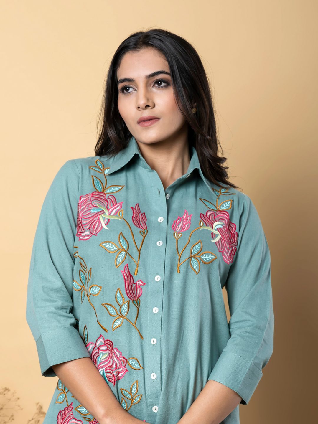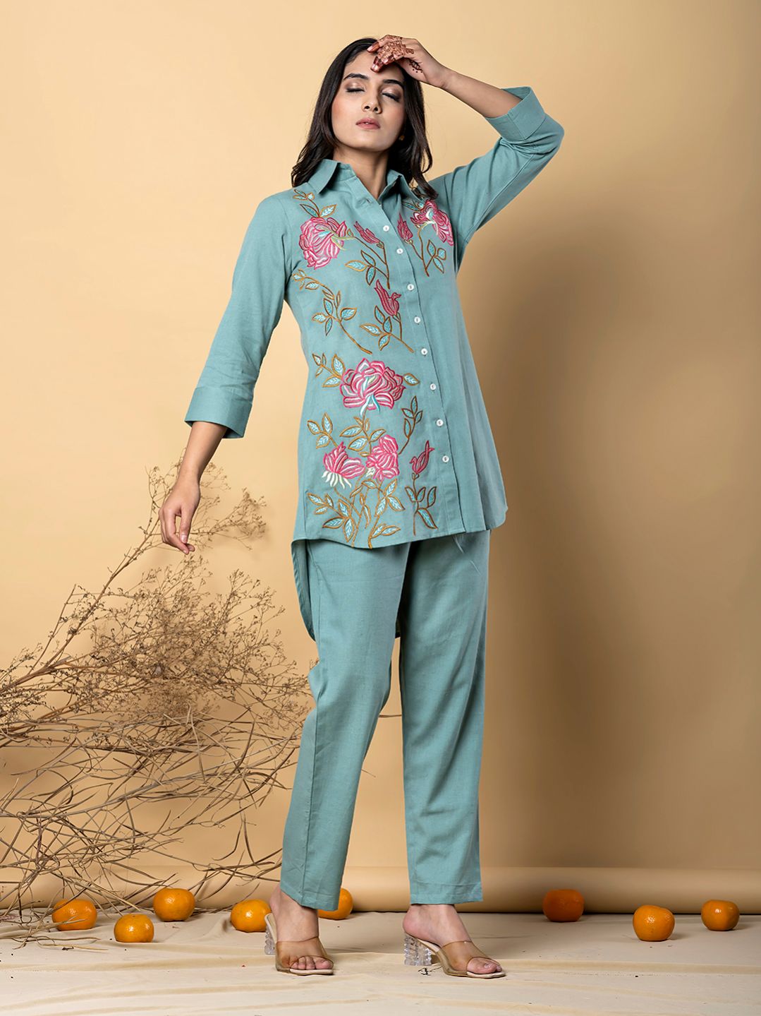 Women Asymmetrical Style Cotton Flex Fabric Sea Green Color Embroidered Work Tunic And Bottom