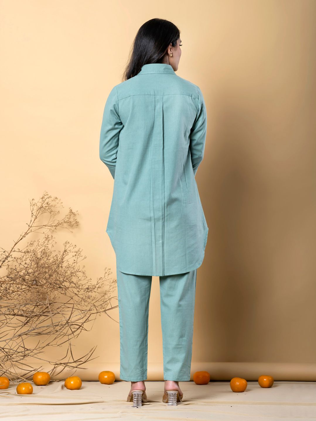 Asymmetrical style cotton flex fabric sea green color co-ord set