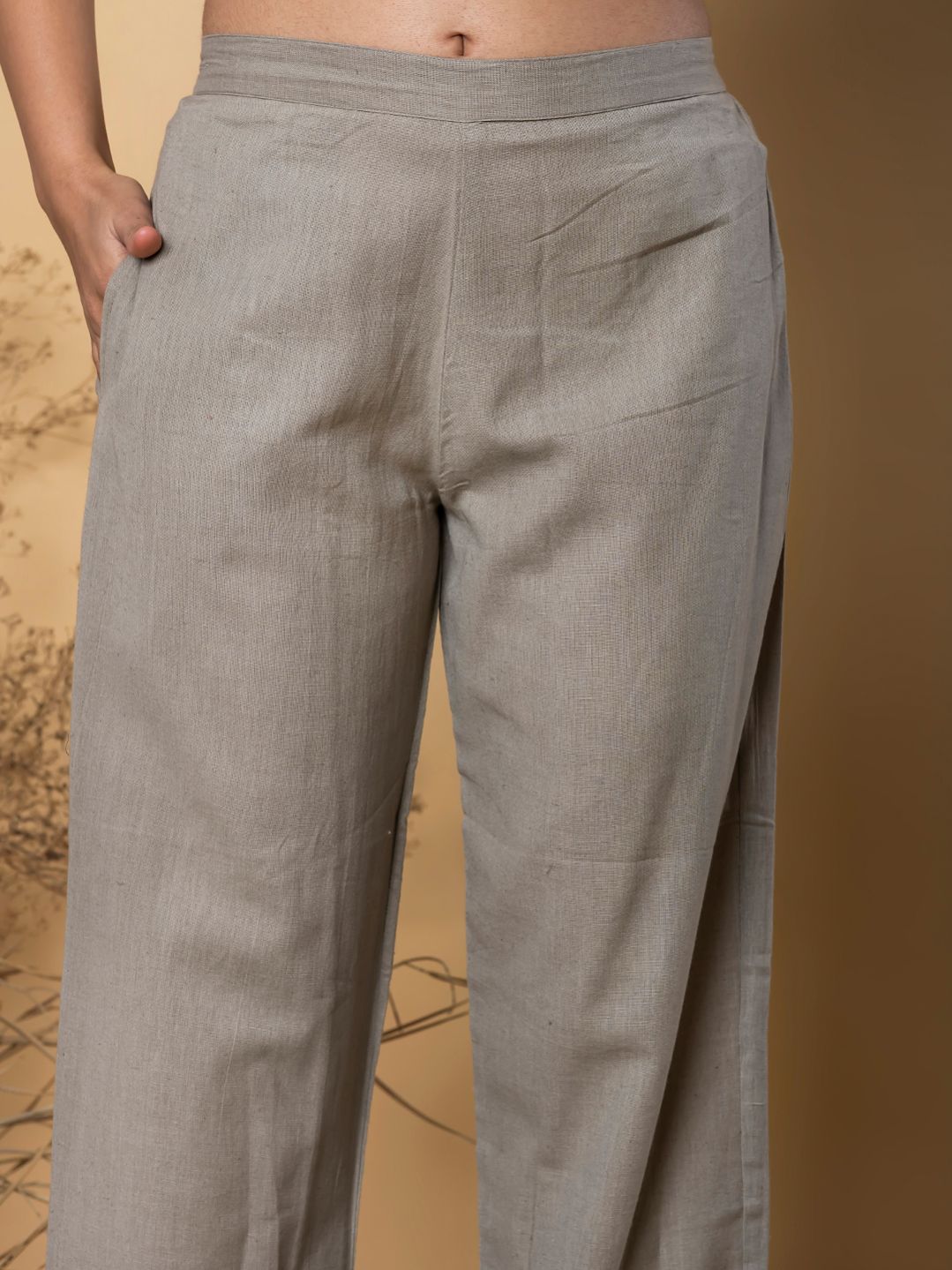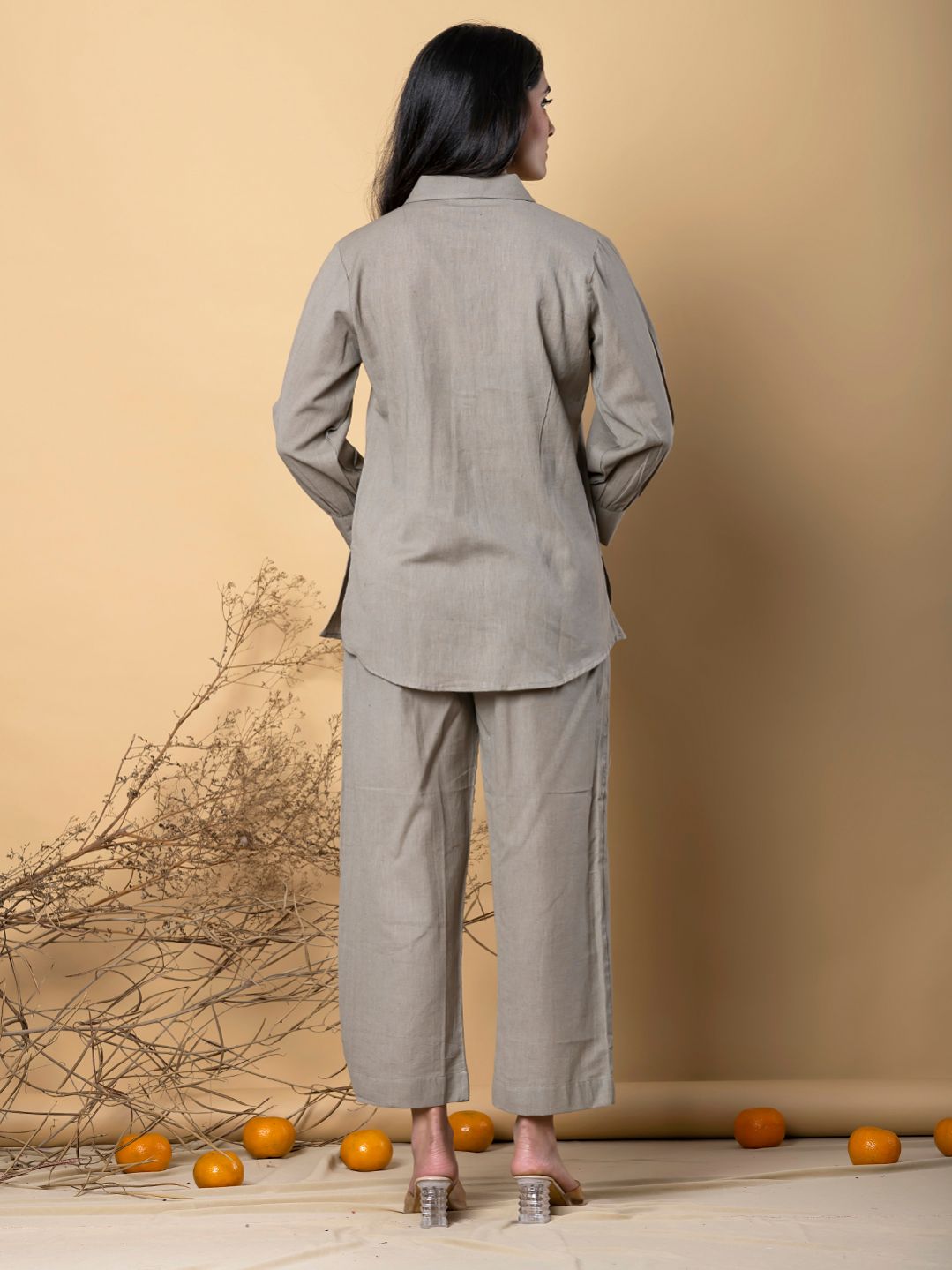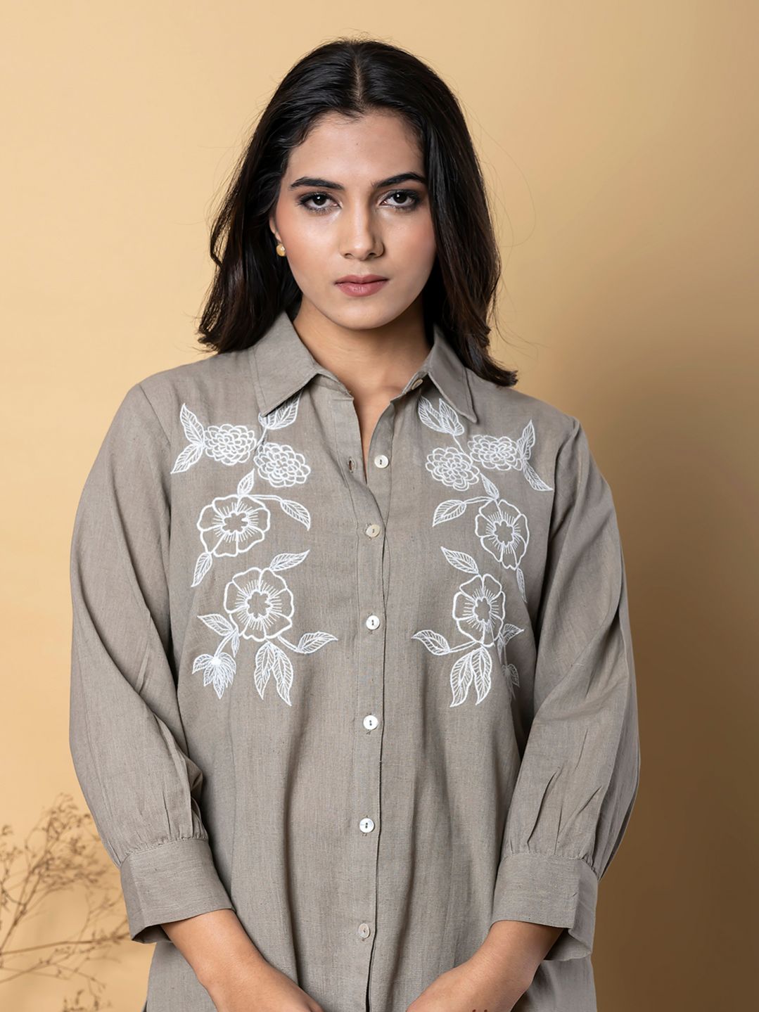 Women Shirt Style Cotton Flex Fabric Olive Color Top And Bottom With Thread Work