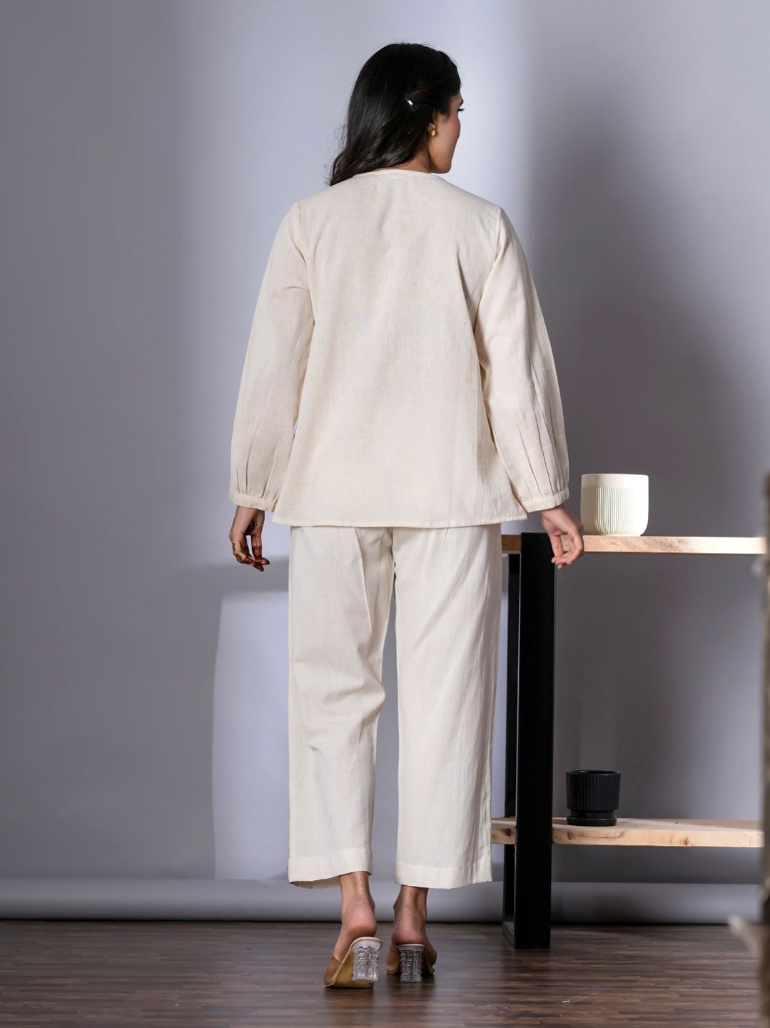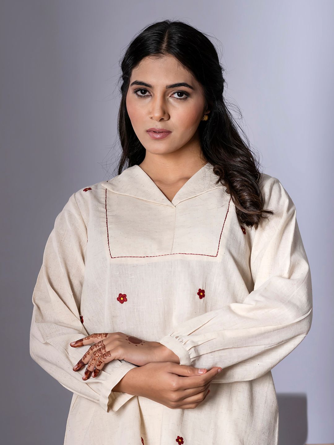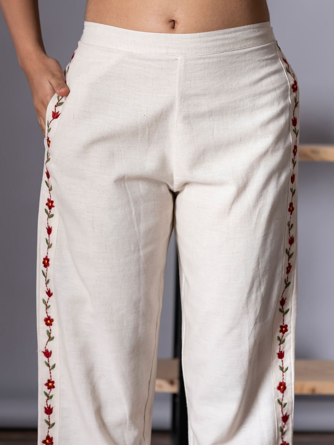 Women Straight Style Cotton Flex Fabric Off White And Red Color Top And Bottom With Thread Work