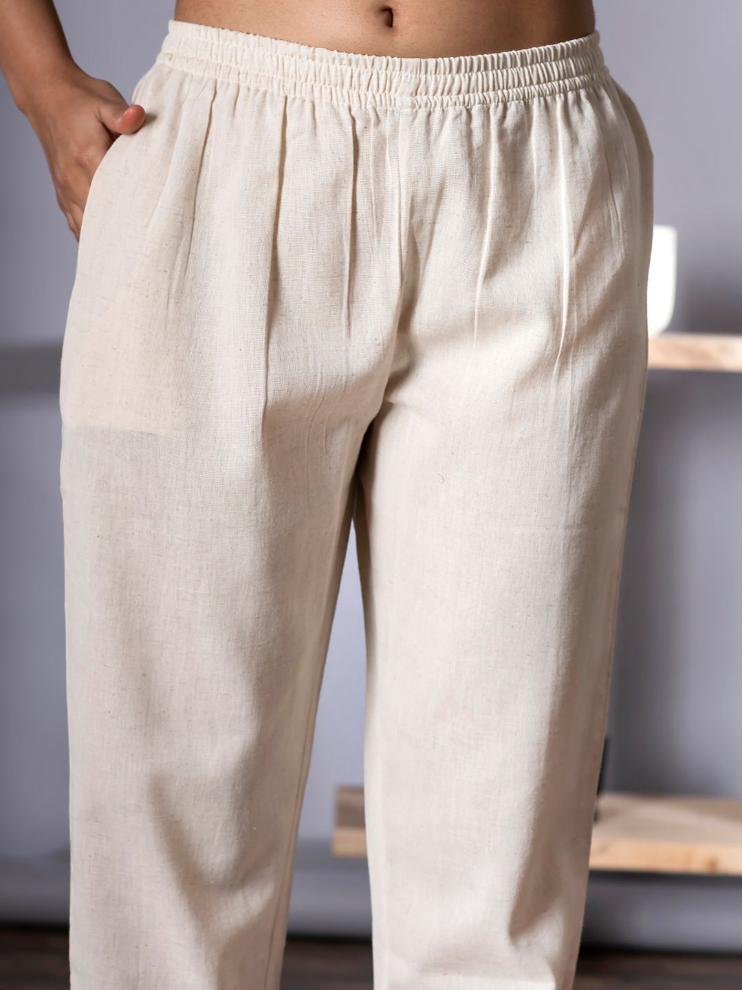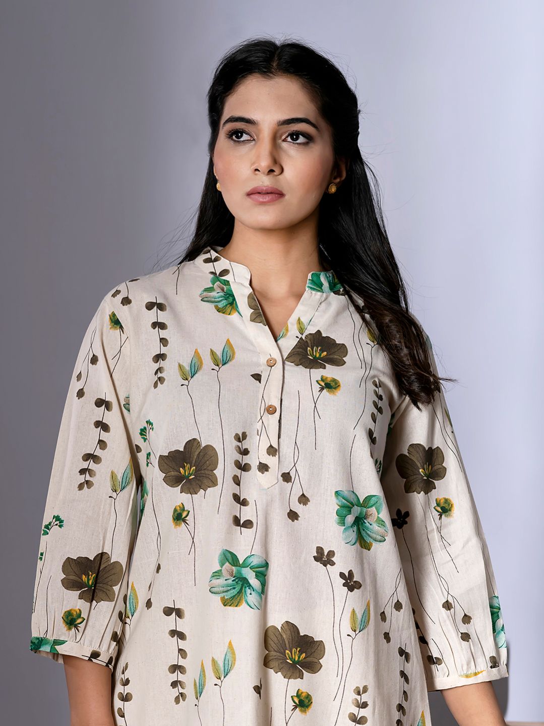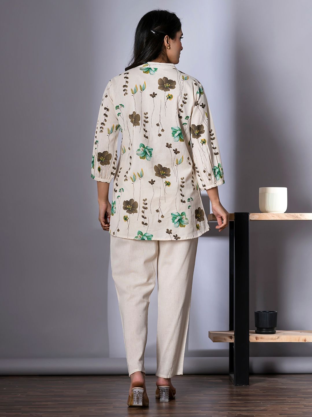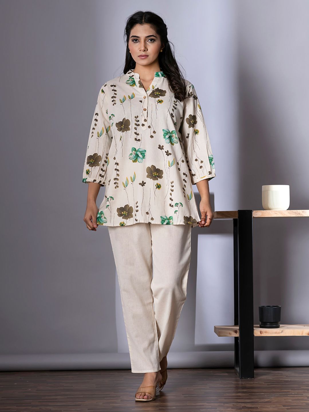 Women Curved Style Cotton Flex Fabric Off White Color Floral Printed Tunic And Bottom