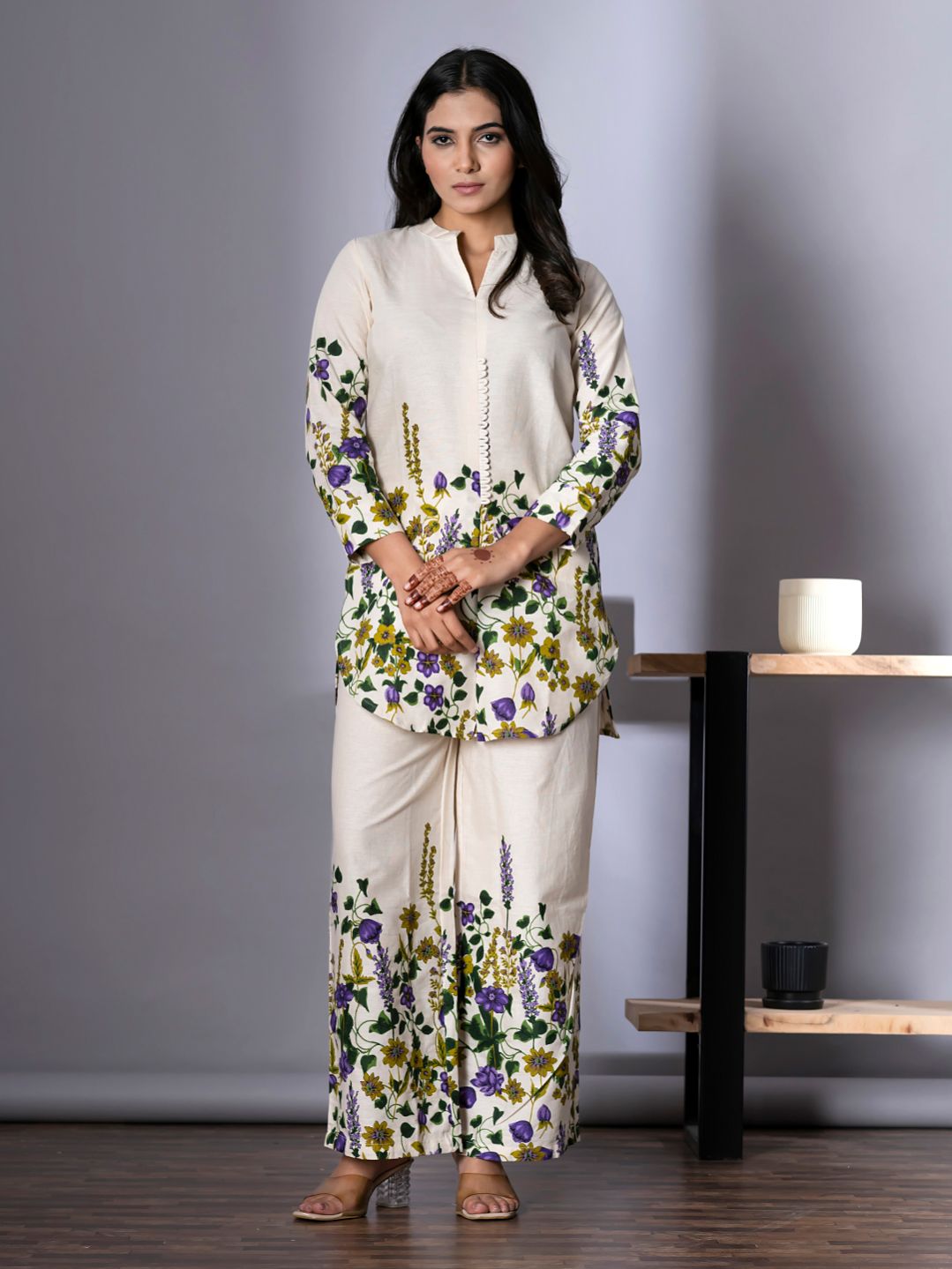 White and Off White color Co-ords Set in Cotton fabric with Thread work