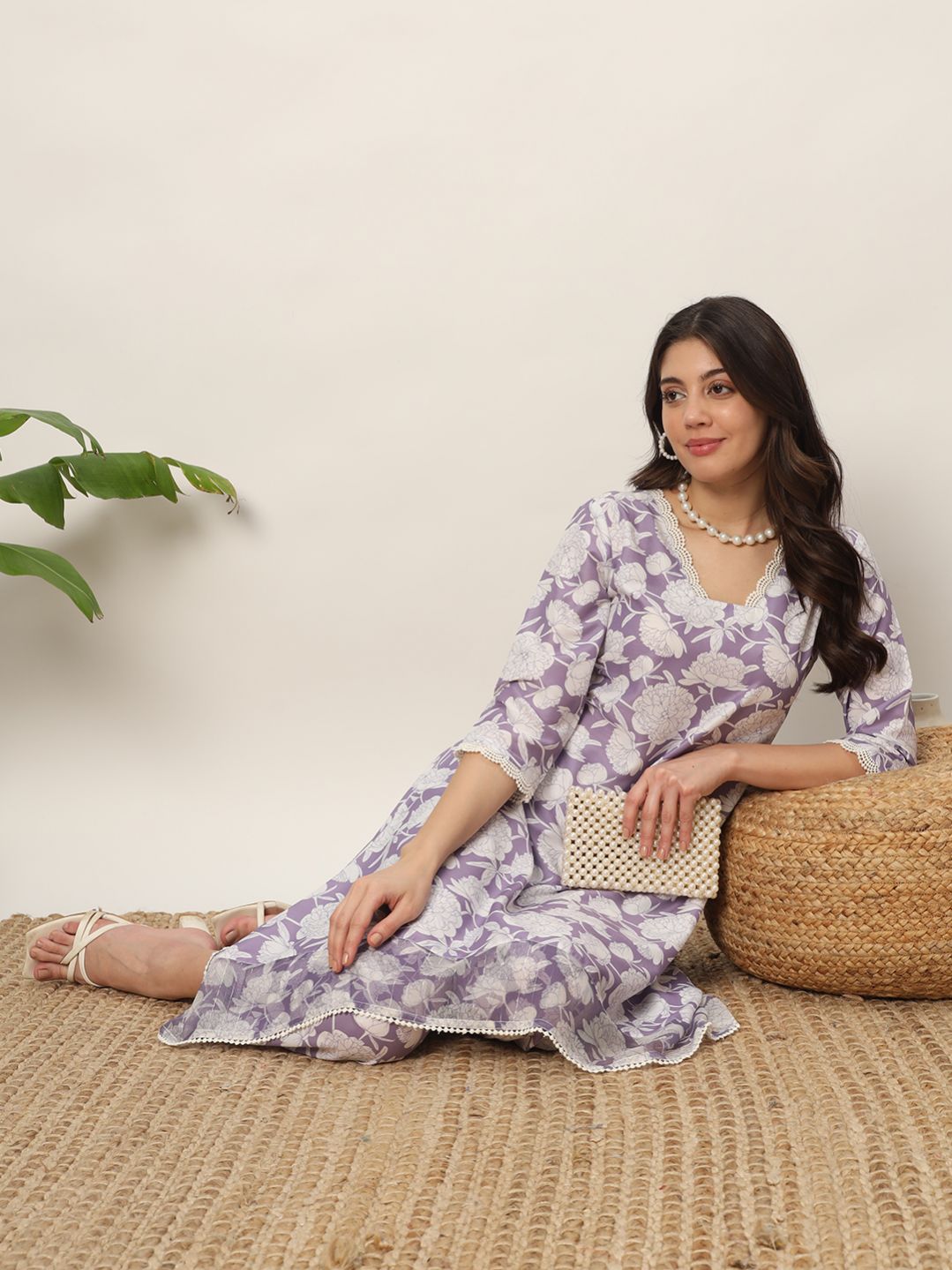 Embrace the timeless grace with this lavender leaf print co-ord set by MIAOW. crafted from cotton blend fabric, it features 3/4th sleeve, v-neck. pair it with ethnic jewelry and sandals to complete your ensemble. Top Material : Cotton Blend || Pant Material : Cotton Blend Package contain: Top || Pant Pattern : Floral Print || Neck Type : V-Neck || Sleeve Type : 3/4th Sleeve