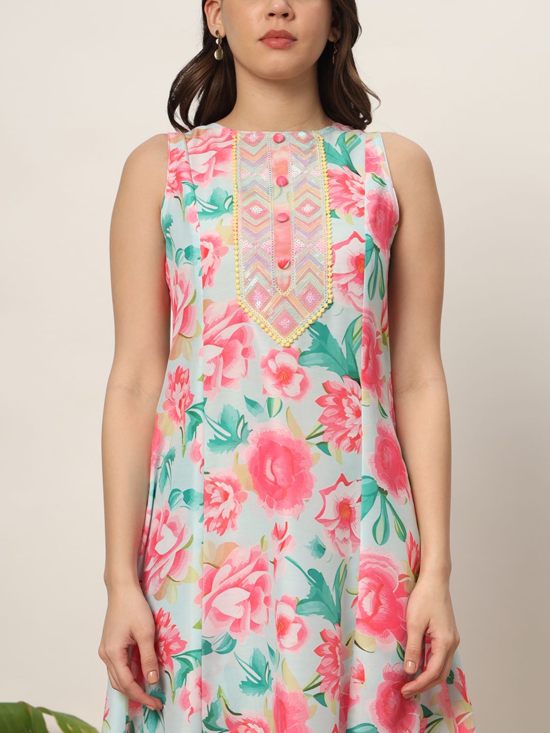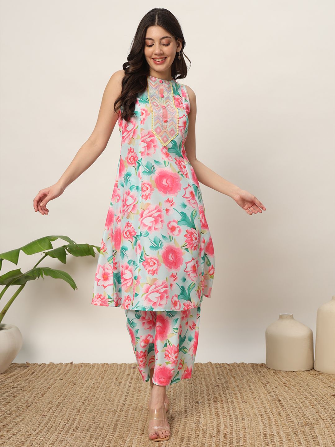 Radiate elegance with MIAOW blush pink Kurta Set, crafted to add a touch of chic sophistication to your wardrobe. Made from a soft cotton blend, this set features an intricate floral print that adds a touch of elegance and charm, ideal for any event. Kurta Material : Cotton Blend || Pant Material : Cotton Blend Style: A-Line Kurta || Calf Length with Sleeveless Package contain: Top || Pant Styling Suggestion: Complete the look with dainty gold jewelry and a matching pink clutch. Opt for nude or metallic heels to complement the ensemble, ensuring a sophisticated and eye-catching appearance.