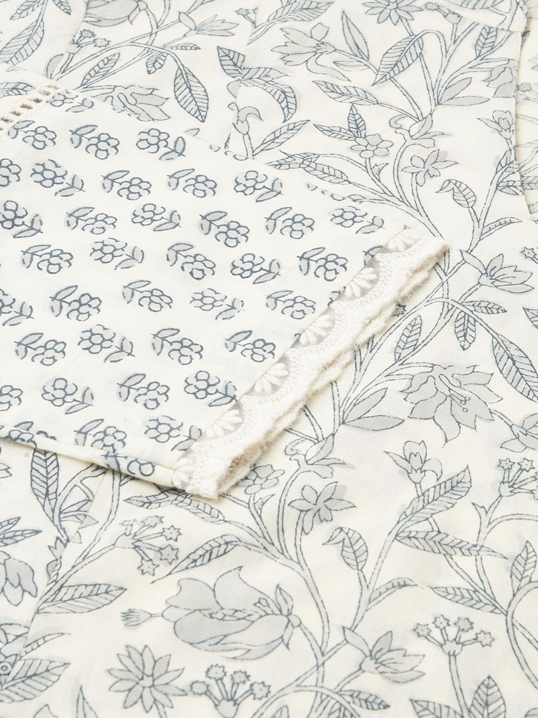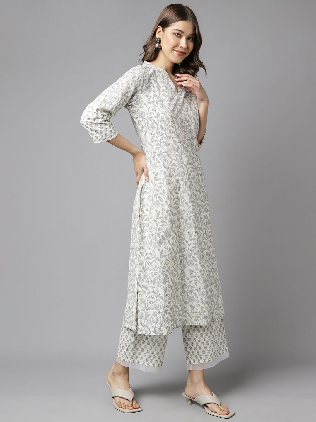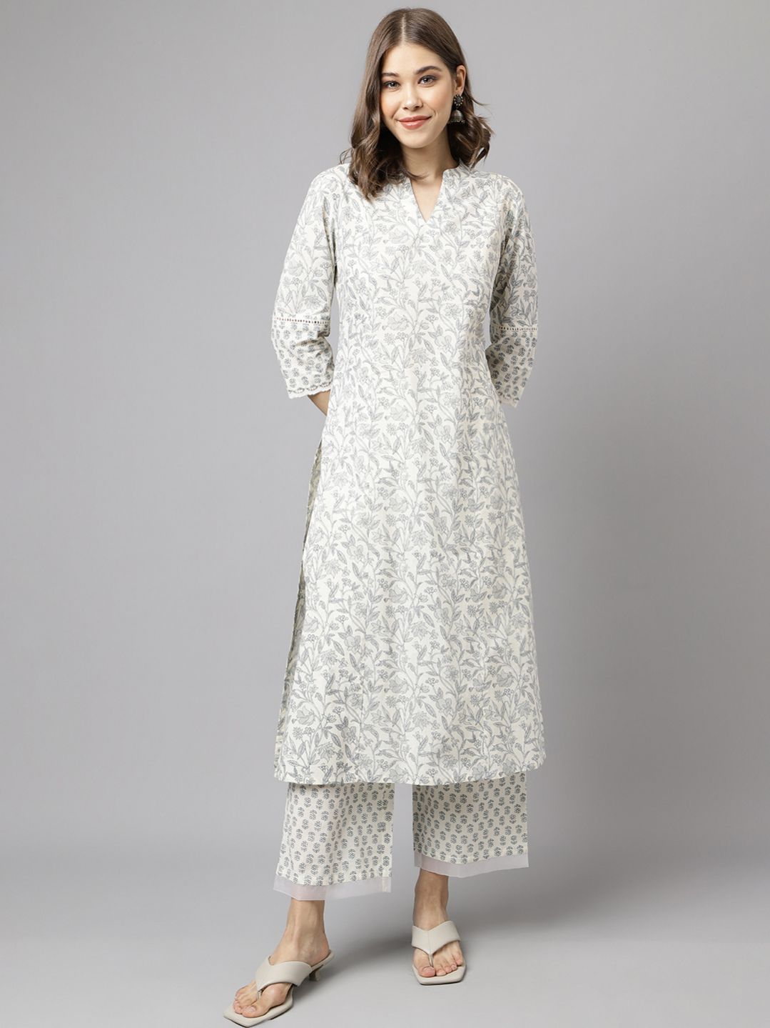 Celebrate grace and sophistication with MIAOW off-white kurta set, where classic design meets modern luxury. Featuring soft cotton and a beautifully detailed floral print, this set combines classic elegance with modern flair, making it a perfect choice for any occasion. Kurta Material: Cotton || Palazzo Material: Cotton Style: A-Line Kurta || Calf Length with 3/4th Sleeve Package contain: Top || Palazzo Styling Suggestion: Pair with your favorite statement jewelry and stylish heels for a look that is both sophisticated and memorable.