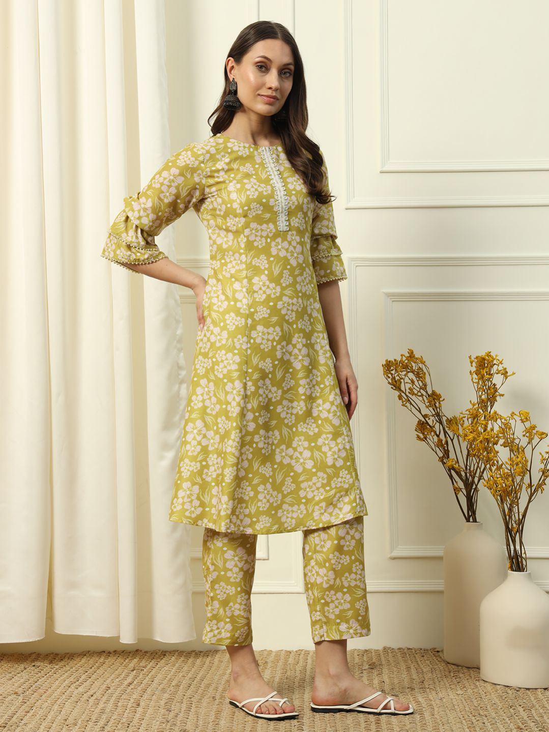Bring a splash of sunshine to your outfit with MIAOW light yellow Kurta Set, designed in a soft cotton blend and adorned with beautiful floral patterns that combines comfort with elegance. Perfect for any occasion, it promises to make you the center of attention with its effortless charm. Kurta Material : Cotton Blend || Pant Material : Cotton Blend Style: A-Line Kurta || Calf Length with Ruffle Sleeve Package contain: Top || Pant Styling Suggestion: Complete your look with dainty gold earrings and a matching bracelet to add a hint of sparkle. Choose soft beige or nude sandals and a structured handbag to create a polished, sophisticated outfit that stands out.