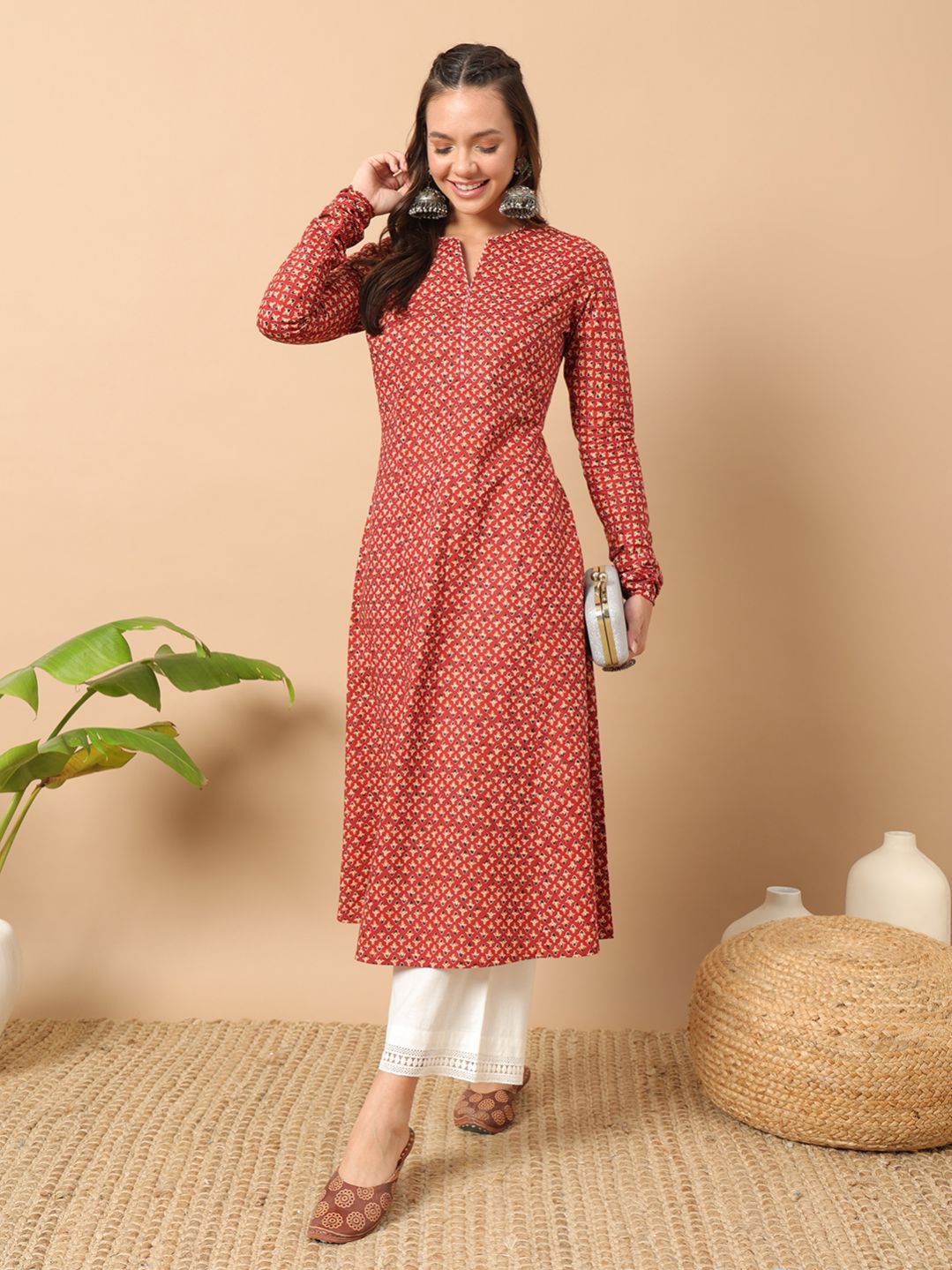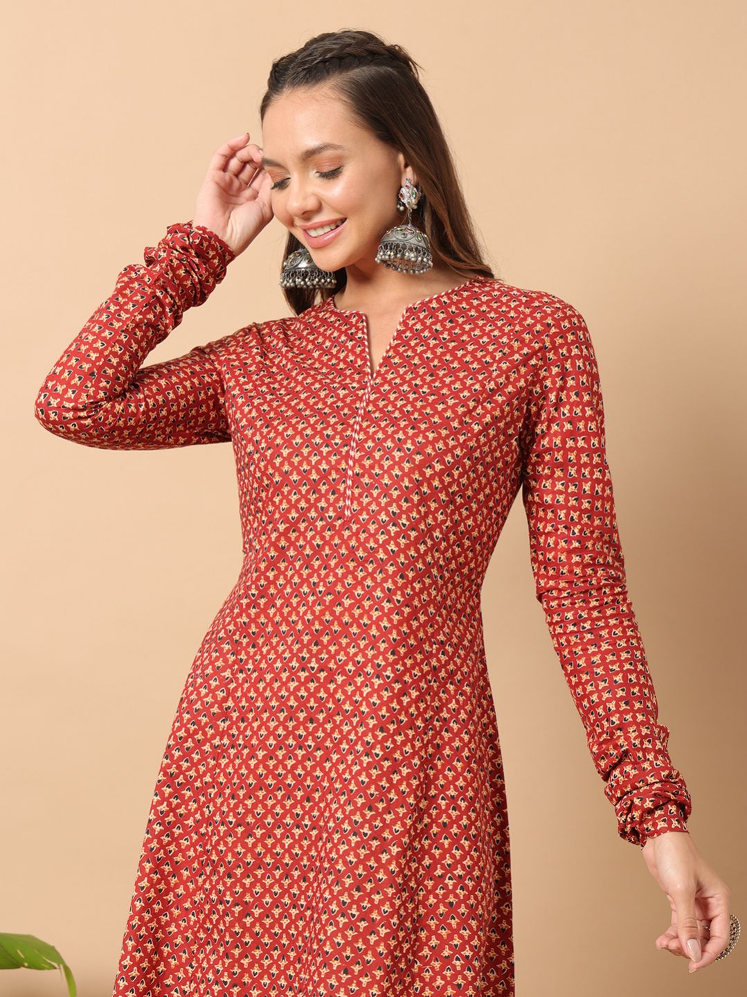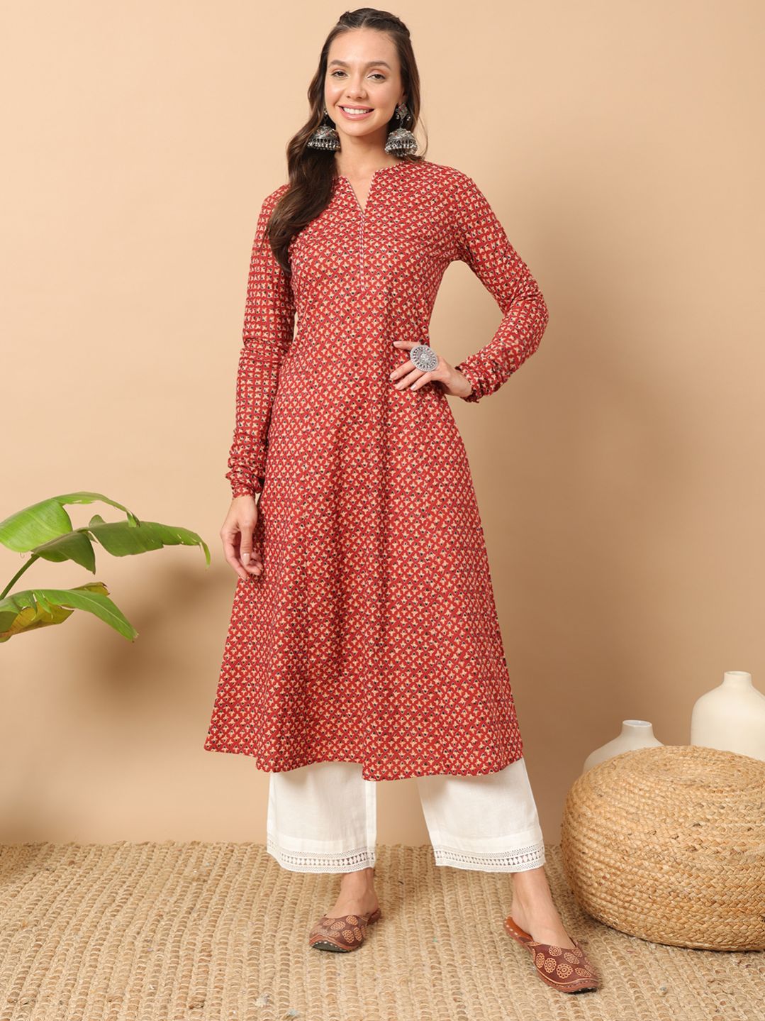 [1] => Floral Printed Red Cotton A-Line Kurta
