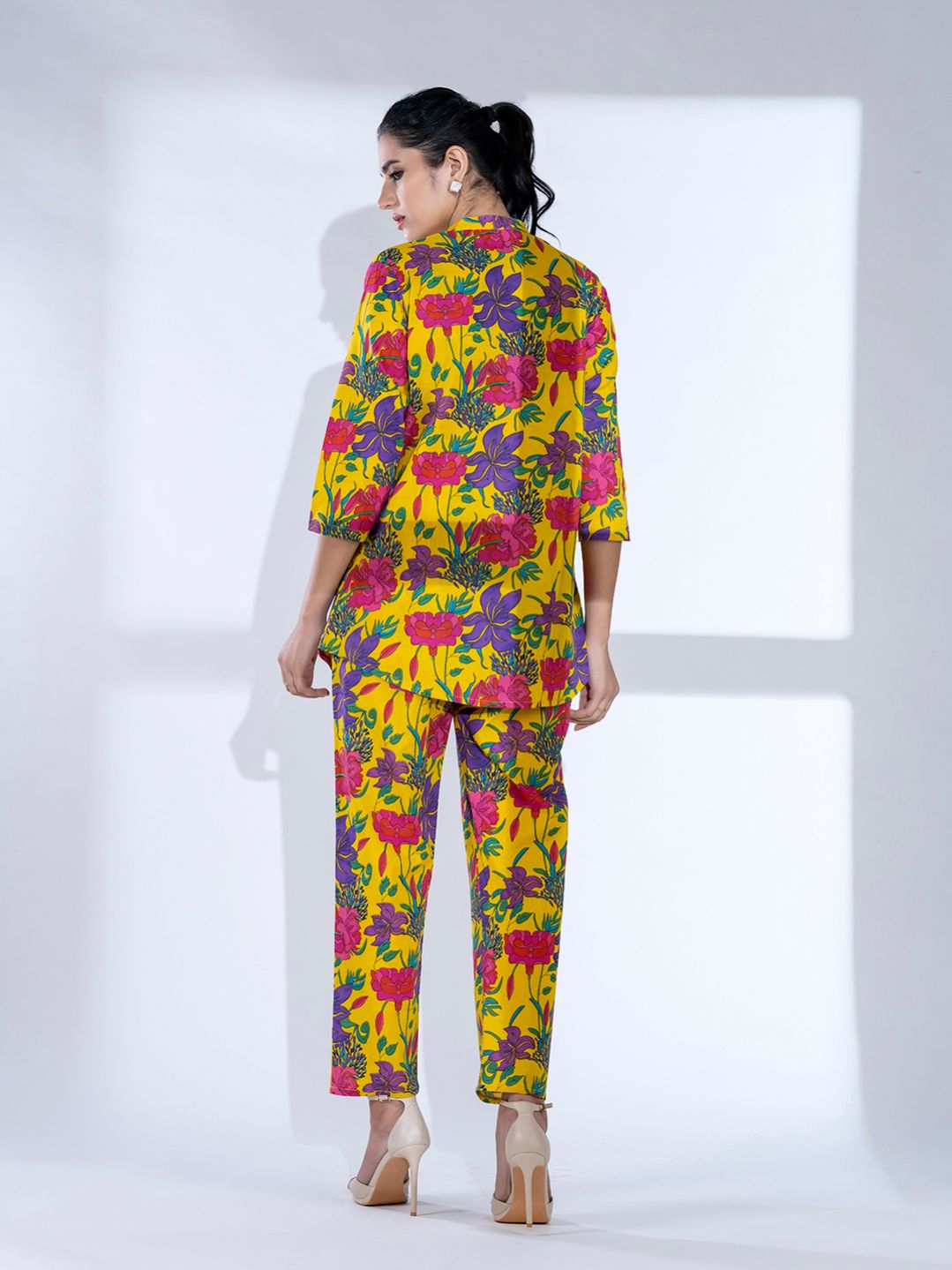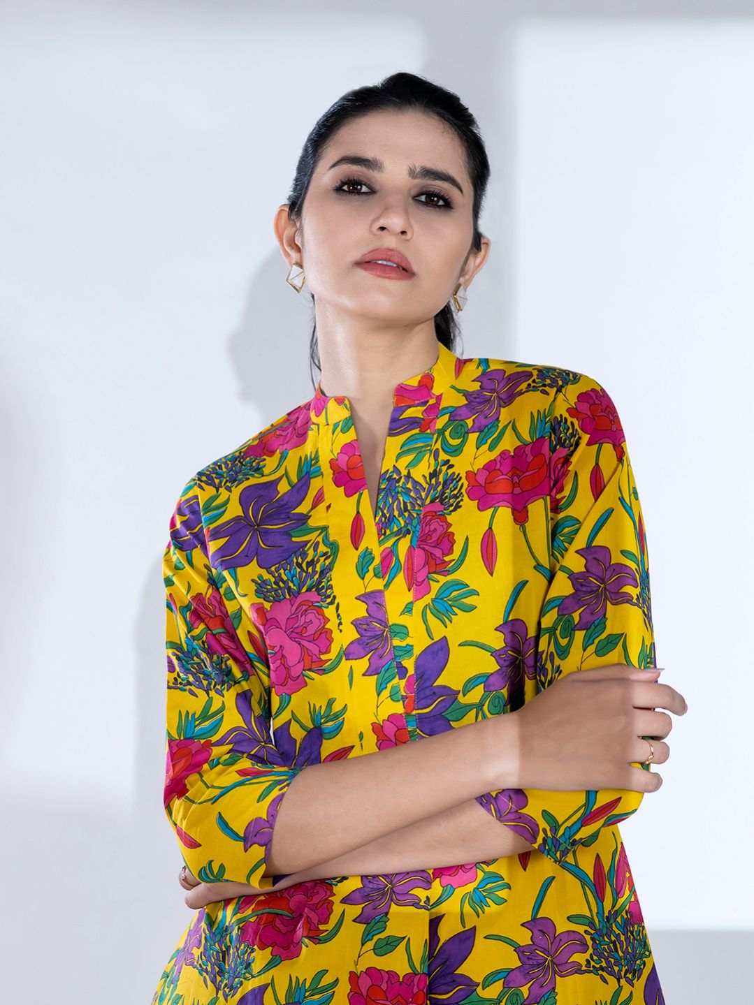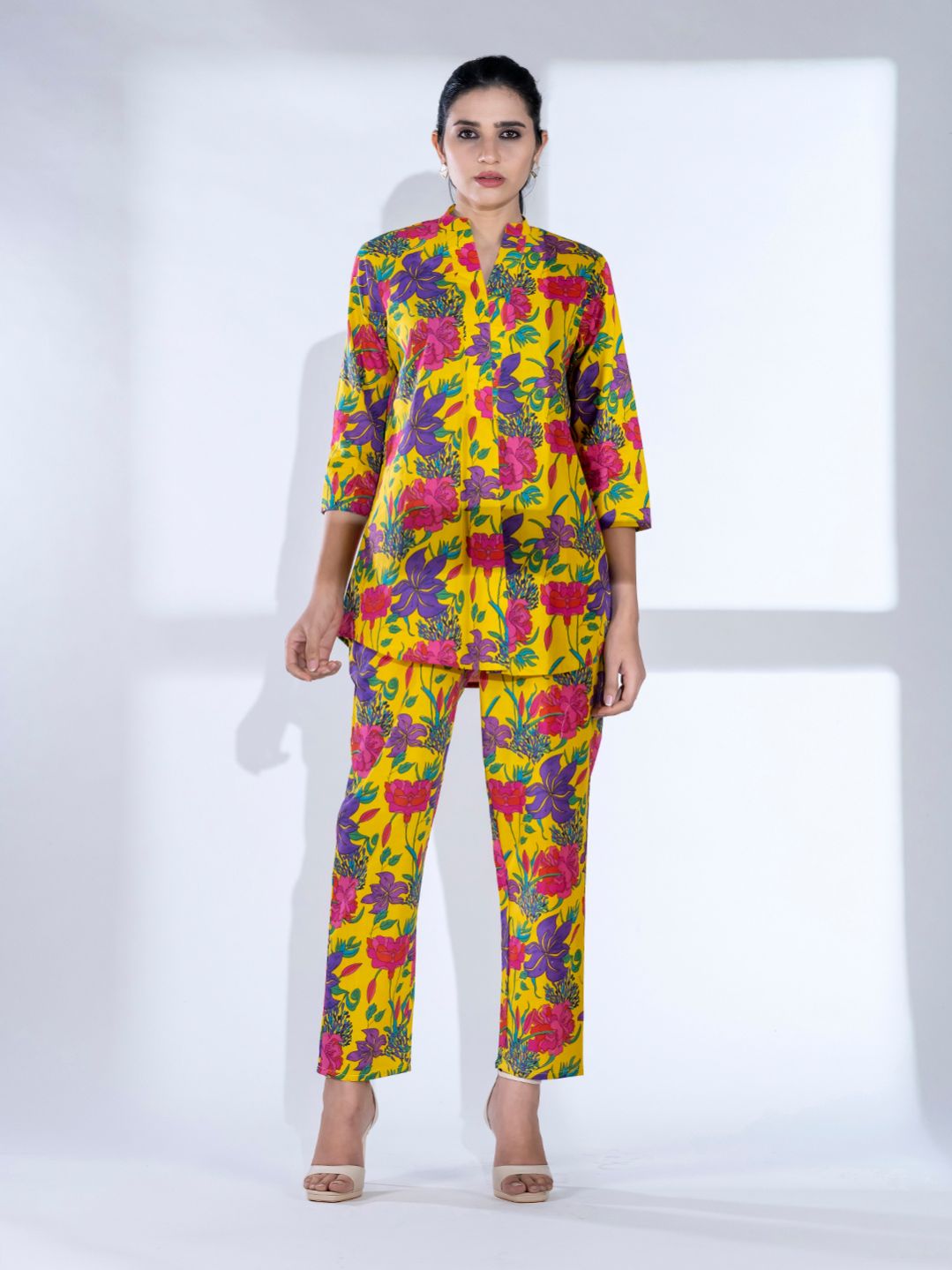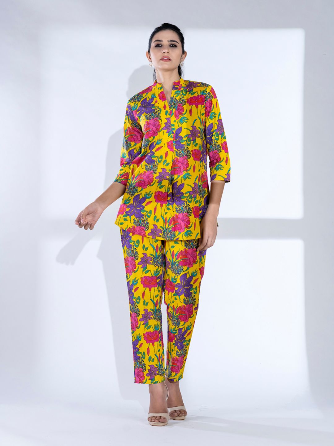 Curved style cotton fabric yellow color co-ord set