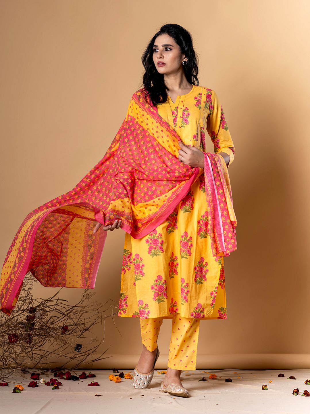 Straight Style Cotton Fabric Yellow Color Cut Dana,Floral Printed Kurti With Palazzo And Dupatta