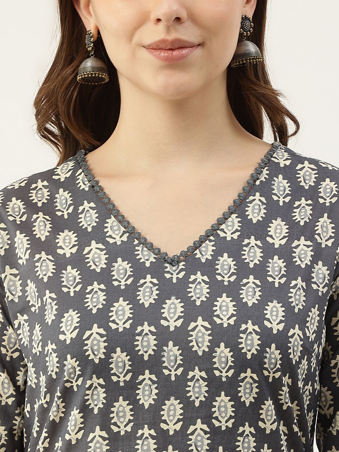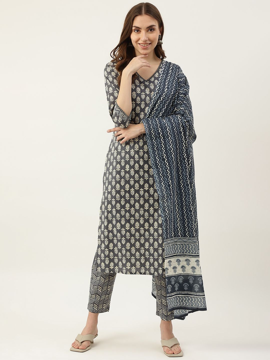Grace your festive occasions with MIAOW sophisticated grey printed kurta set, designed to elevate your style with timeless elegance. Crafted from soft cotton, this calf-length kurta features a sleek V-neck and three-quarter sleeves, designed in a straight silhouette for timeless elegance. Paired with coordinating pants and a matching dupatta, this set seamlessly blends comfort and sophistication, perfect for festive and party occasions. Kurta Material: Cotton || Pant Material: Cotton || Dupatta Material: Cotton Style: Straight kurta || Calf Length with 3/4 Sleeve Package contain: Top || Bottom || Dupatta Styling Suggestion: Pair with silver or metallic accessories and stylish wedges for a contemporary look that stands out at any celebration