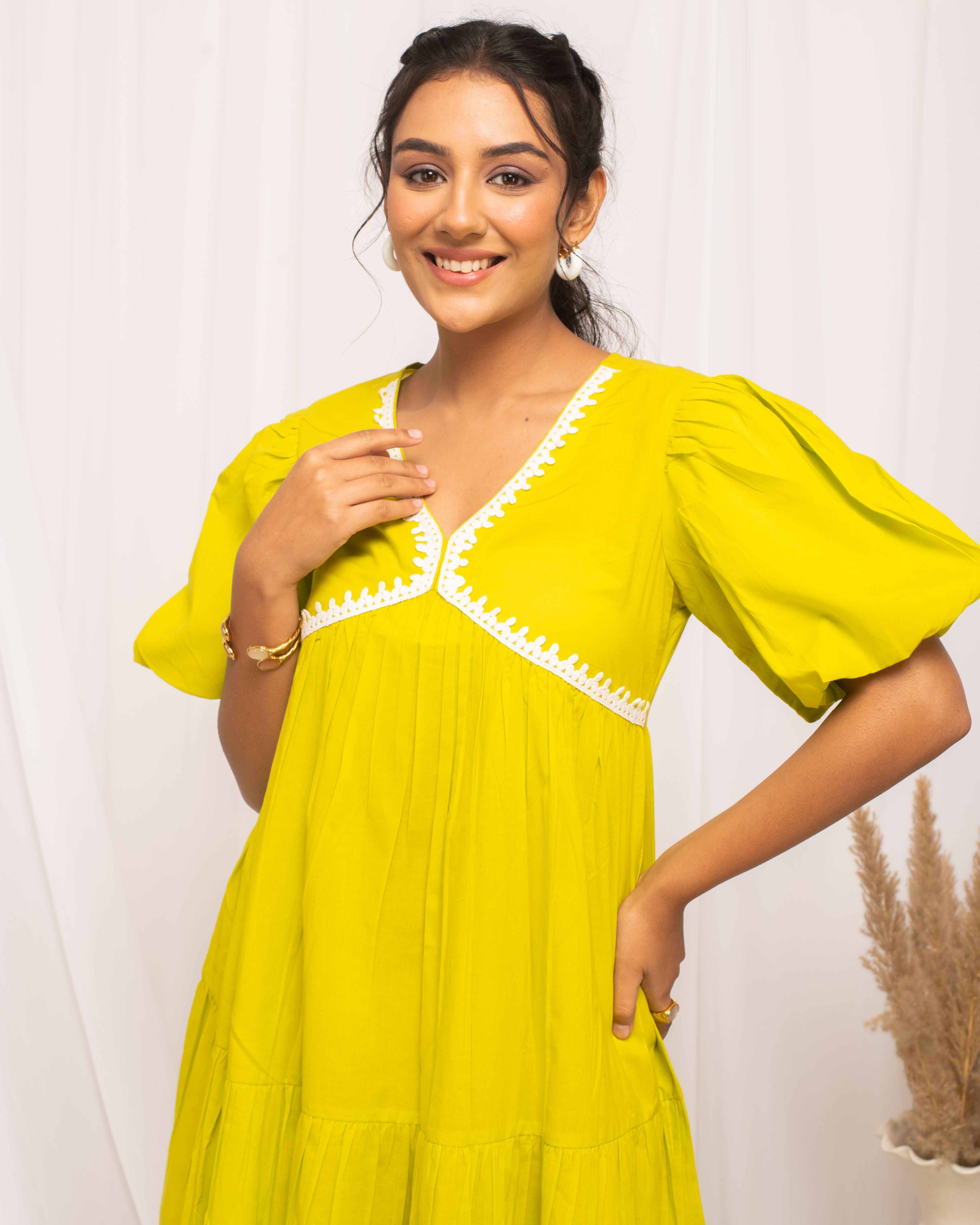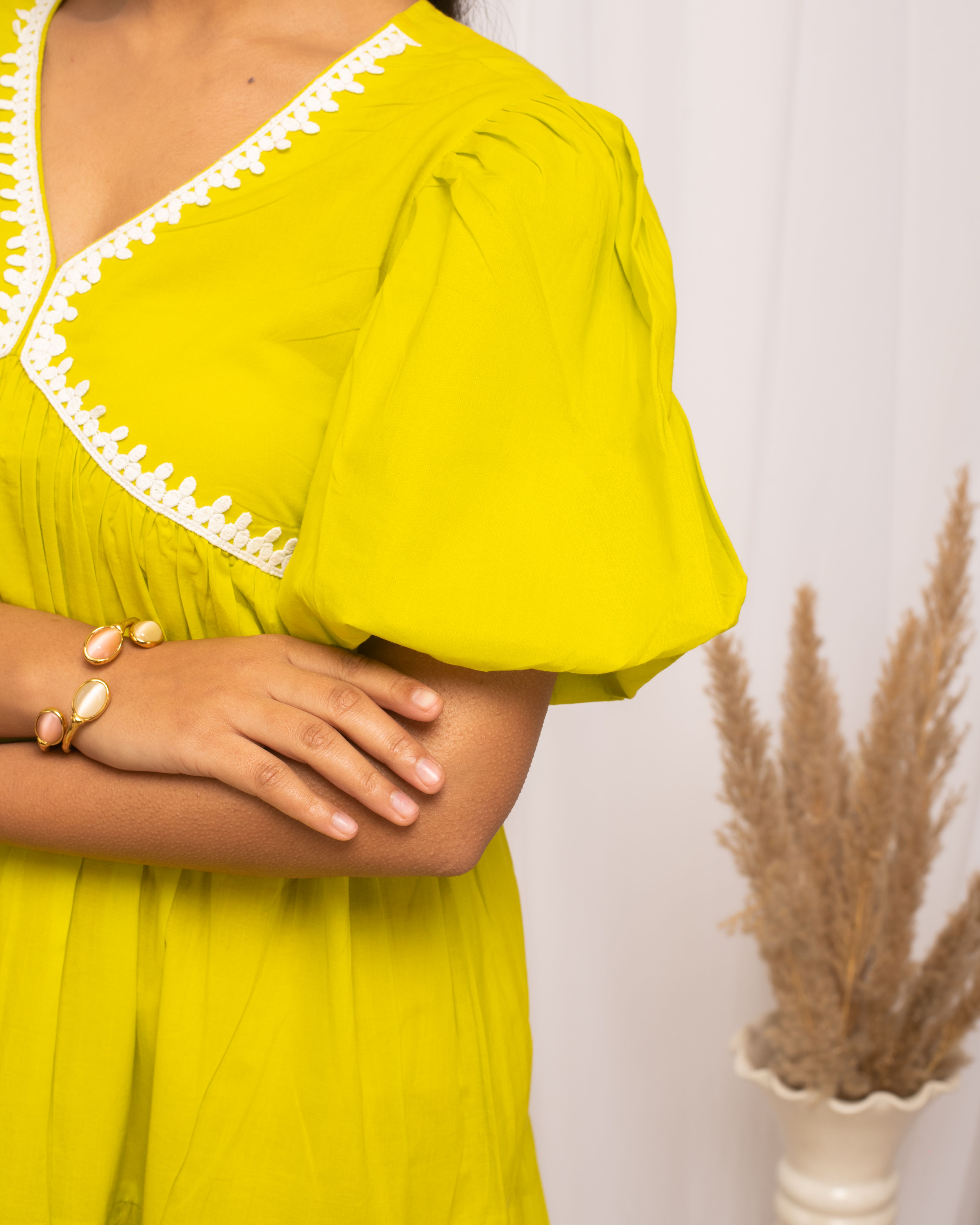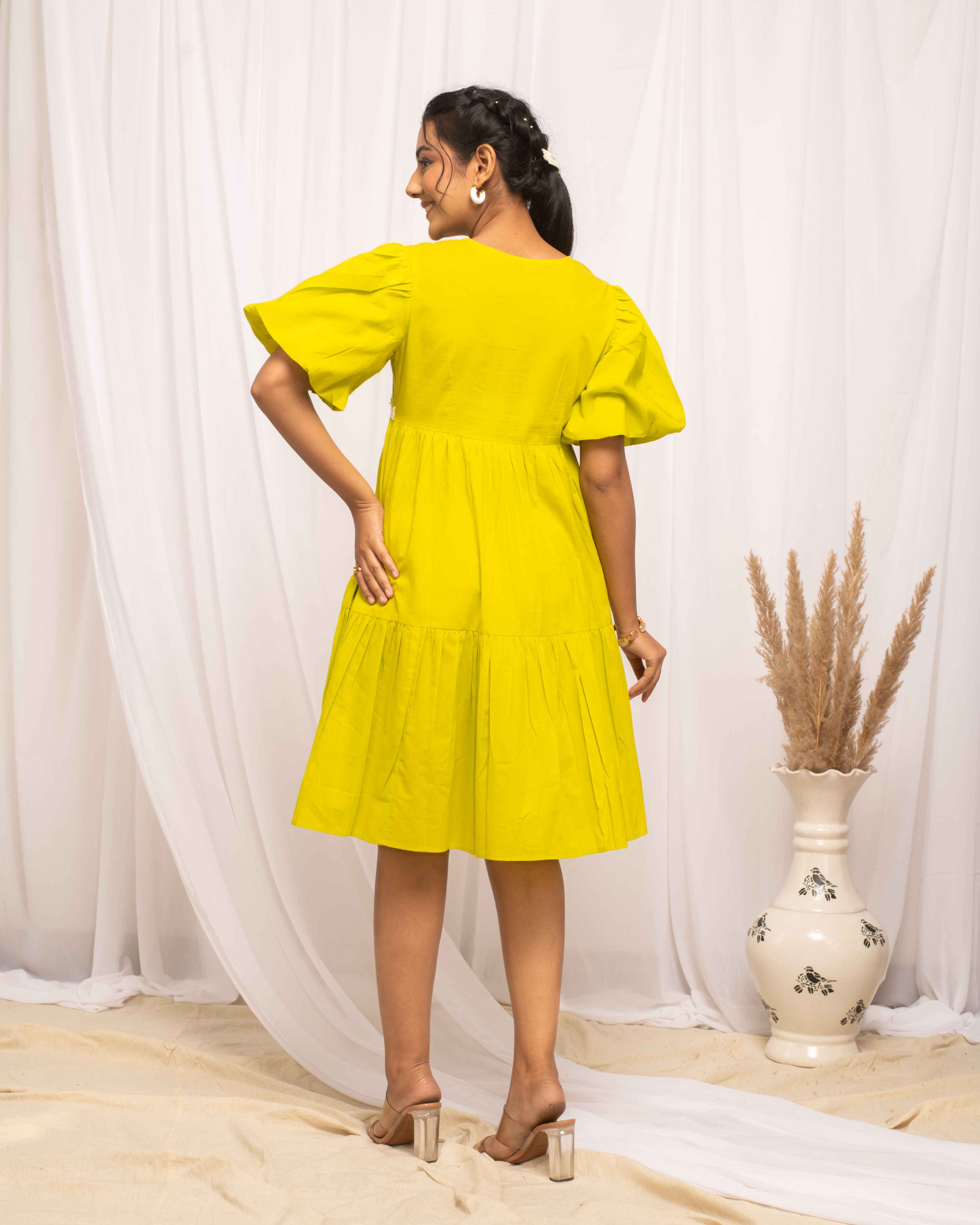 Make a vibrant statement in MIAOW Lemon Yellow Cotton Skater Dress. Its bold color and comfortable cotton fabric combine with a flirty skater skirt to create a piece that's both fun and fashionable. Ideal for adding a burst of sunshine to your outfit, it’s perfect for various events. Dress Material: Cotton Style: Skater Dress || Knee Length with Puff Sleeve Package contain: 1 Dress Styling Suggestion: Accessorize with a matching yellow scarf and simple white loafers for a cohesive look. Enhance the brightness of the dress with a playful, bright-colored clutch. Opt for minimal makeup with a focus on a radiant complexion and a swipe of gloss for a fresh, dewy finish.