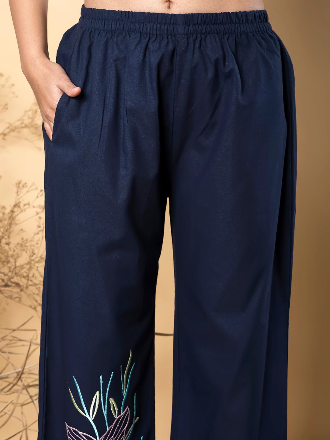 Women Curved Style Cotton Flex Fabric Navy Blue Color Resham,Embroidered Tunic And Bottom