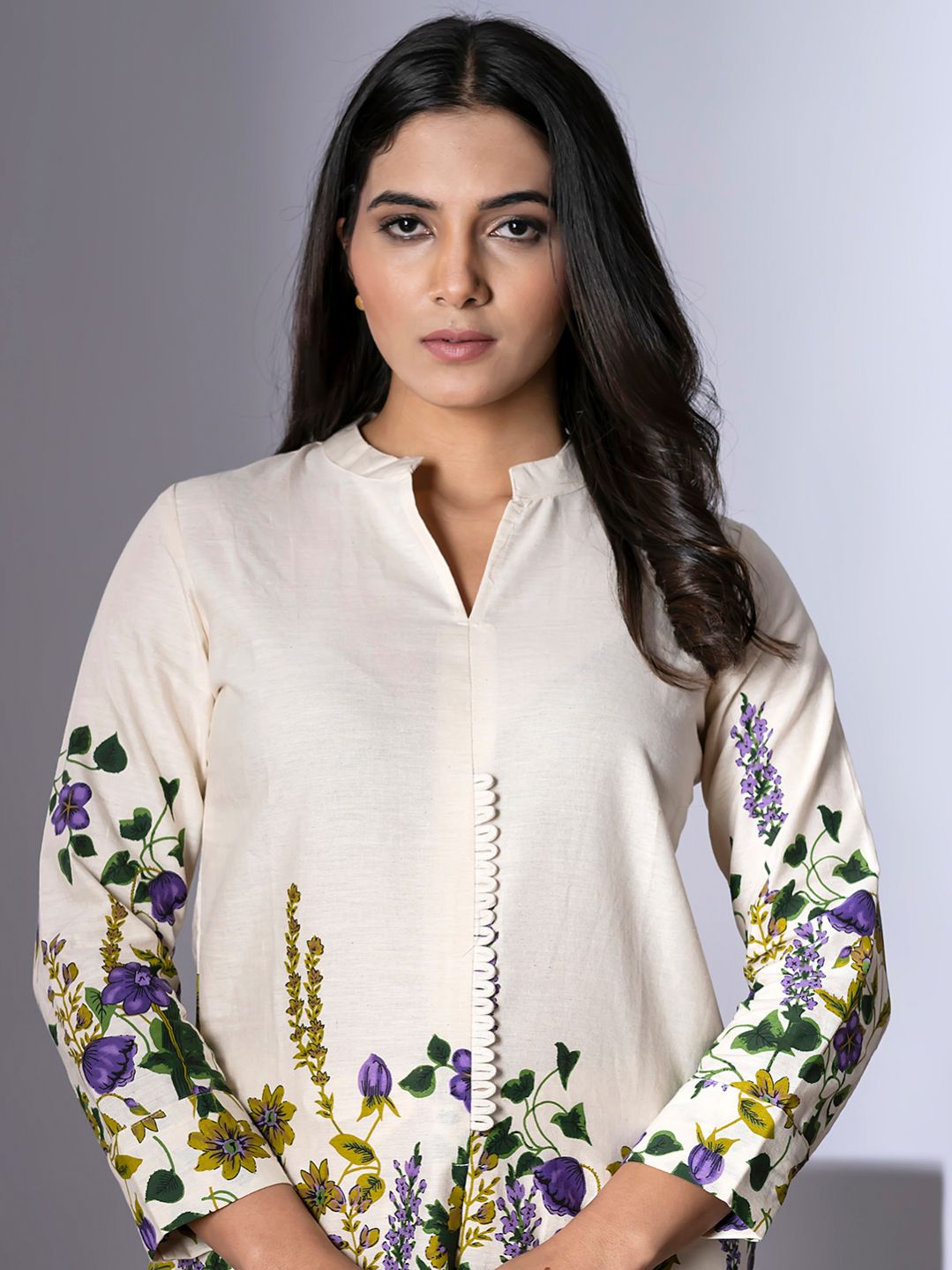 White and Off White color Co-ords Set in Cotton fabric with Thread work