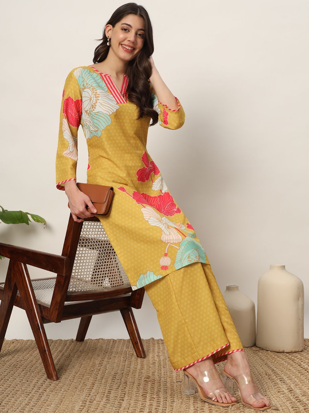 The MIAOW Yellow Floral Print Kurta Set, crafted from a soft cotton blend, features a V-neck, 3/4th sleeves, and a straight-cut style, offering a vibrant and comfortable look. Kurta Material : Cotton Blend || Palazzo Material : Cotton Blend Style: Straight Kurta || Calf Length with 3/4th Sleeve Package contain: Top || Palazzo