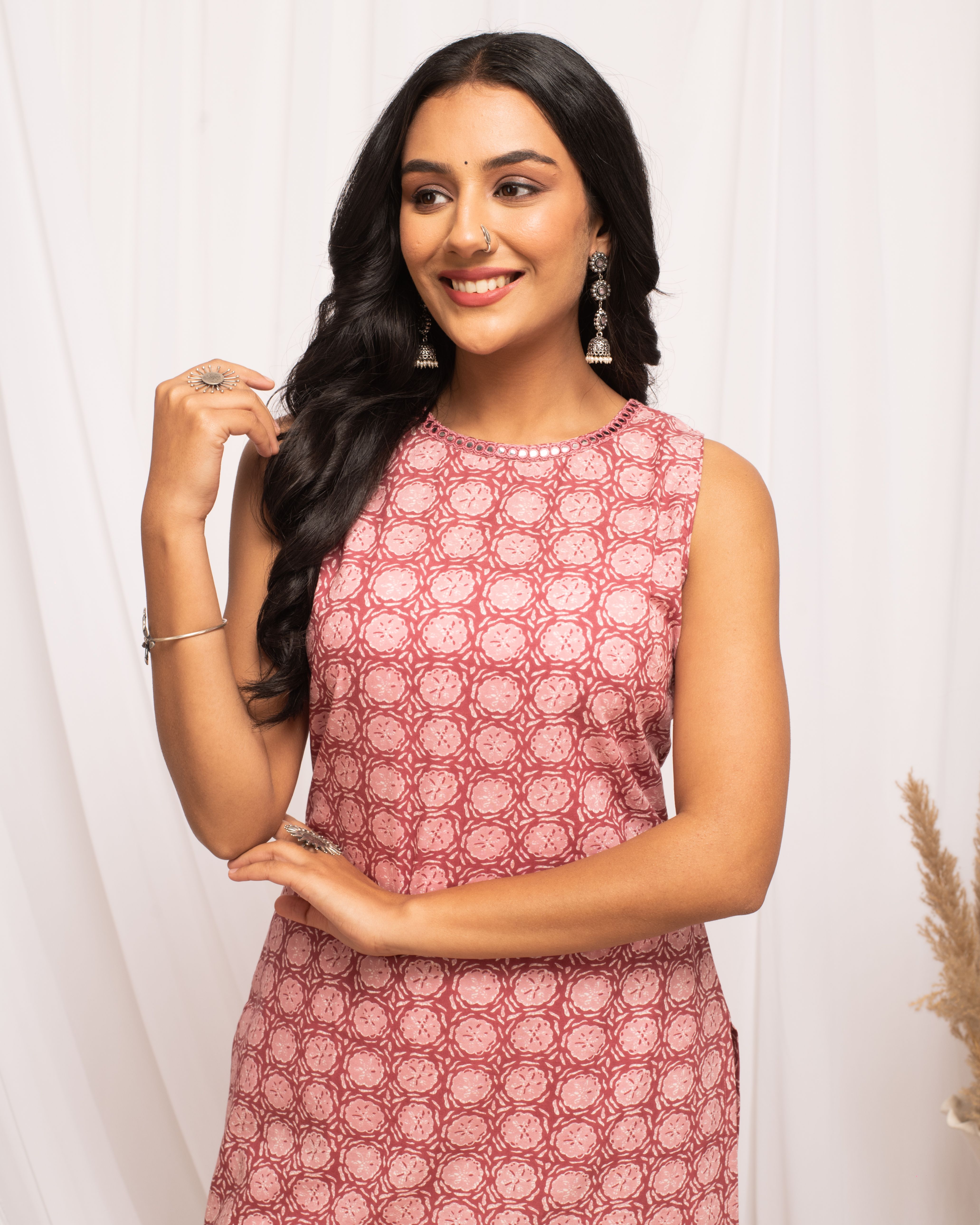 Breathe new life into your wardrobe with MIAOW pink cotton straight kurta, adorned with timeless floral prints. The vibrant pink hue combined with intricate floral detailing makes this piece a versatile option for both casual and festive occasions. Kurta Material: Cotton Style: Straight Kurta || Calf Length with Sleeveless Package contain: Top Styling Suggestion: Style it with silver jhumkas and white churidar pants for a classic yet modern appeal. Add a pair of strappy sandals and a light dupatta for a touch of elegance, perfect for any day out or gathering.