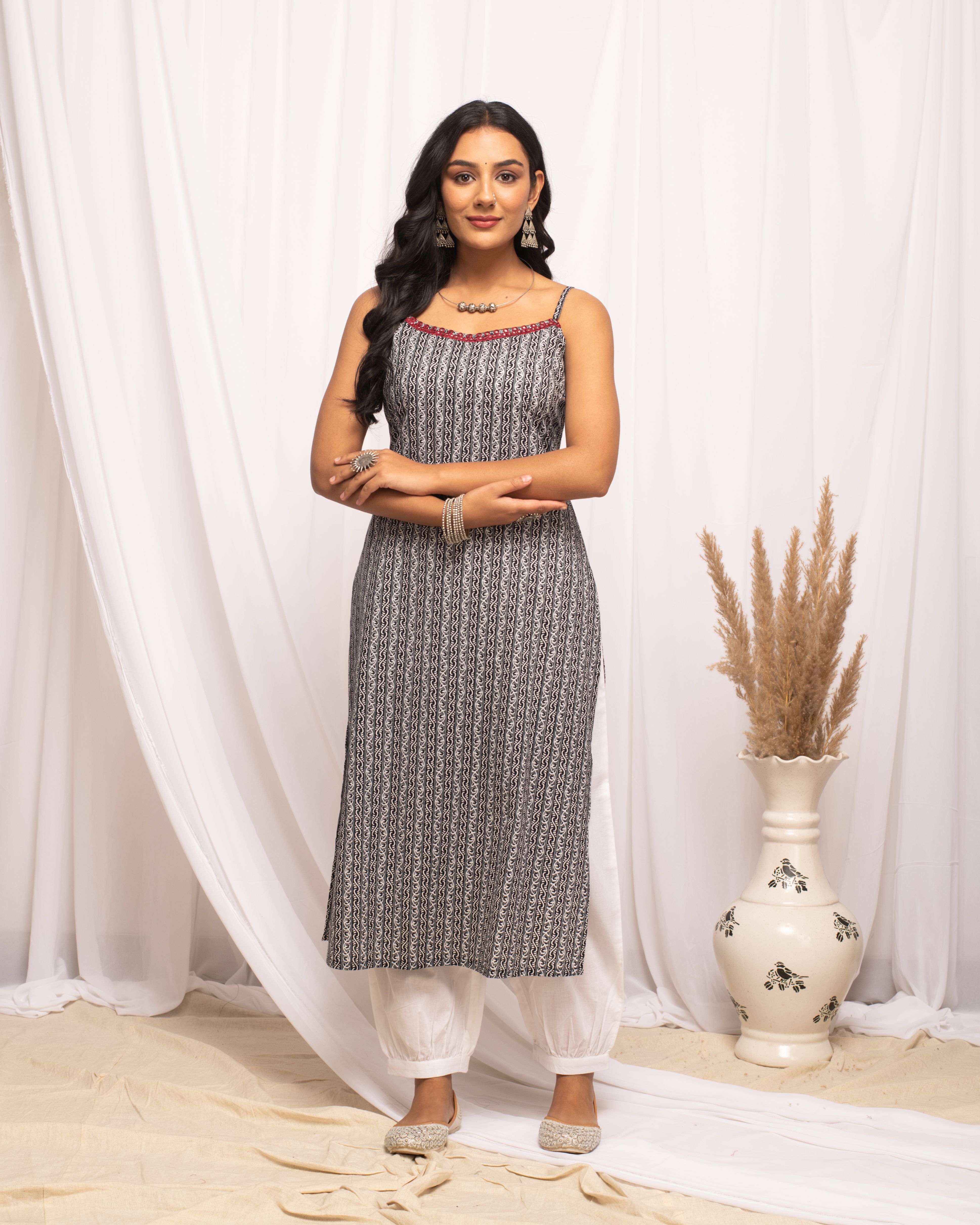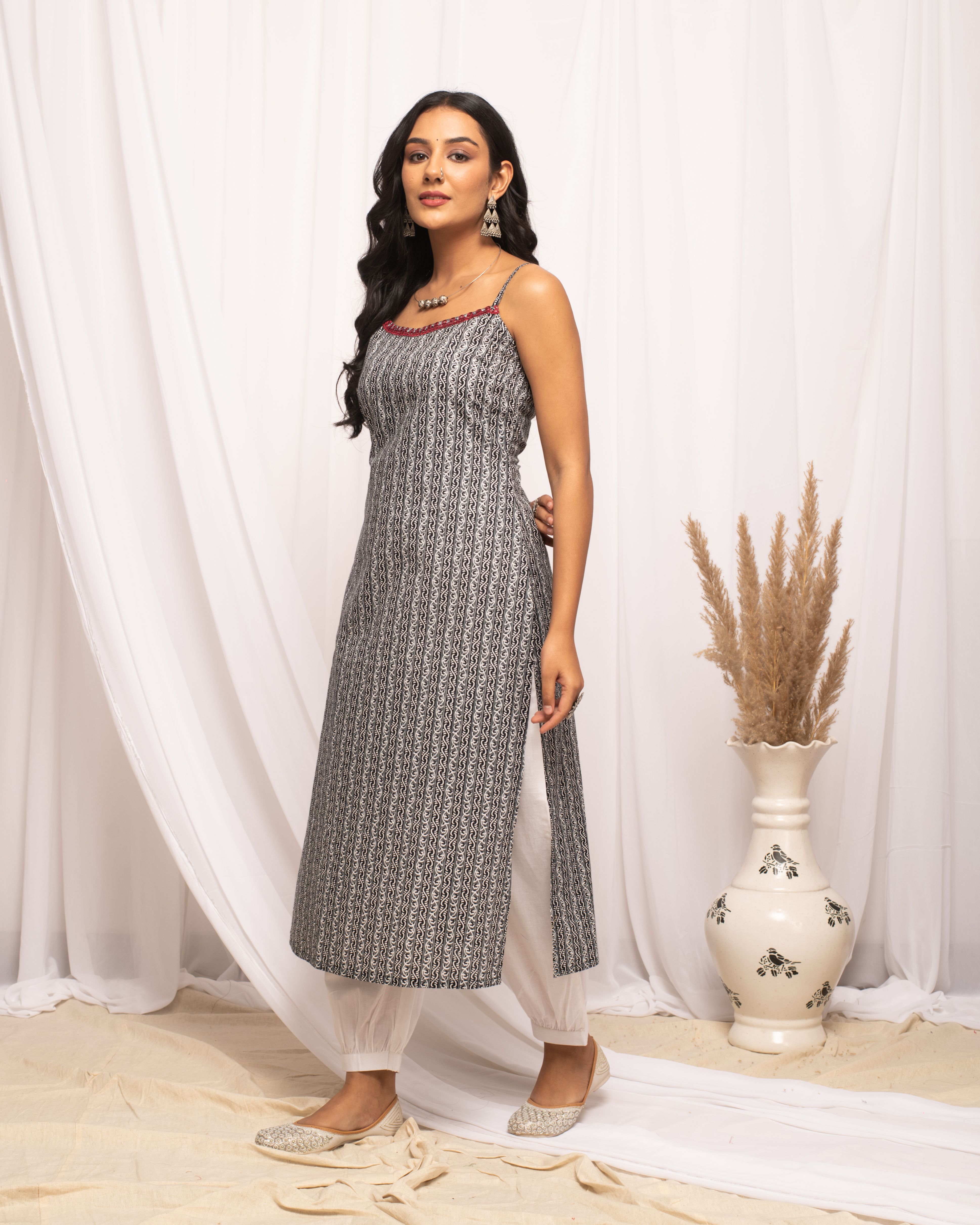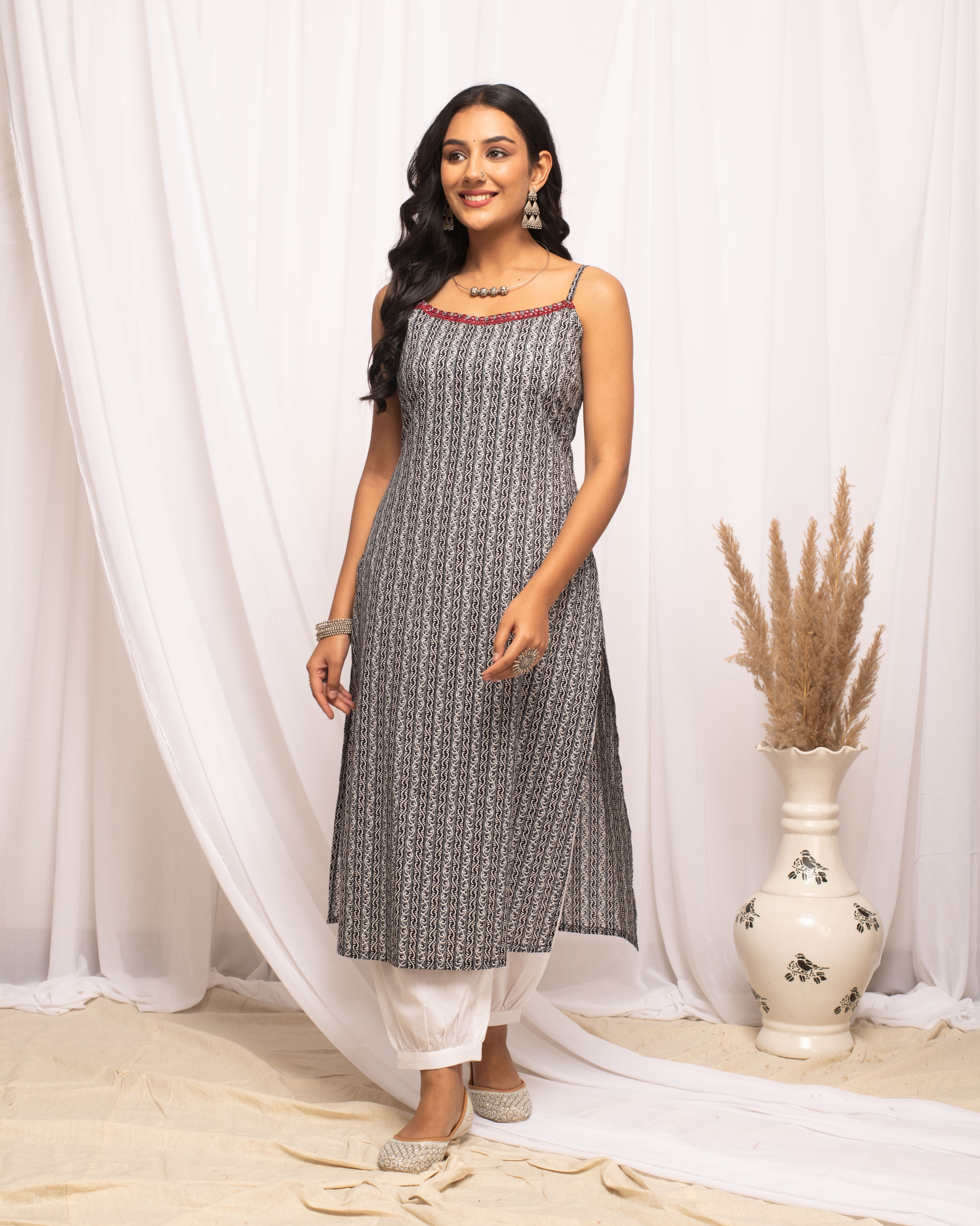 Elevate your everyday wardrobe with MIAOW black cotton straight kurta. Featuring bold, strip prints, this design adds a contemporary twist to a timeless silhouette. Kurta Material: Cotton Style: Straight Kurta || Calf Length with Sleeveless Package contain: Top Styling Suggestion: Pair with sleek black leggings or skinny jeans for a streamlined look. Add a pop of color with a bright scarf or statement necklace and complete the outfit with chic loafers or minimalistic sneakers.