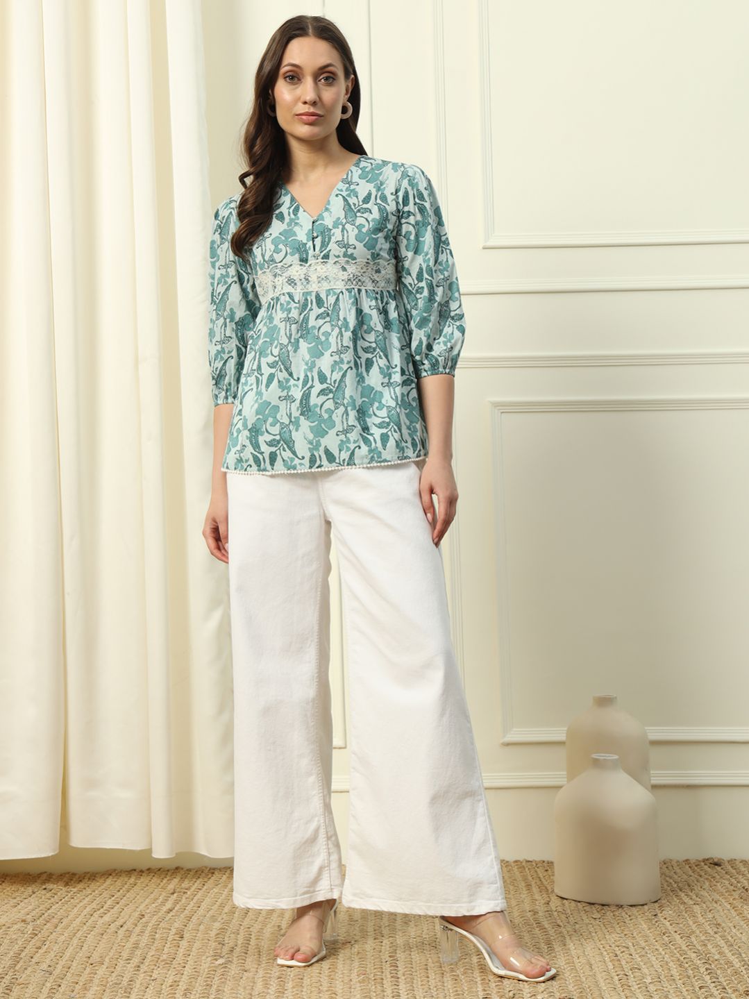 Refresh your wardrobe with the MIAOW women's top in a serene sky blue hue. Crafted from soft, breathable cotton, this top features delicate lace accents that enhance its charming printed pattern. The 3/4th sleeves and elegant V-neckline create a flattering, versatile silhouette that's perfect for any occasion. Embrace effortless style and timeless elegance with this beautifully designed piece. Top Material : Cotton || Work : Printed Style: Length: 27.5 (inch) || Sleeve : 3/4th Sleeve Package contain: 1 Top