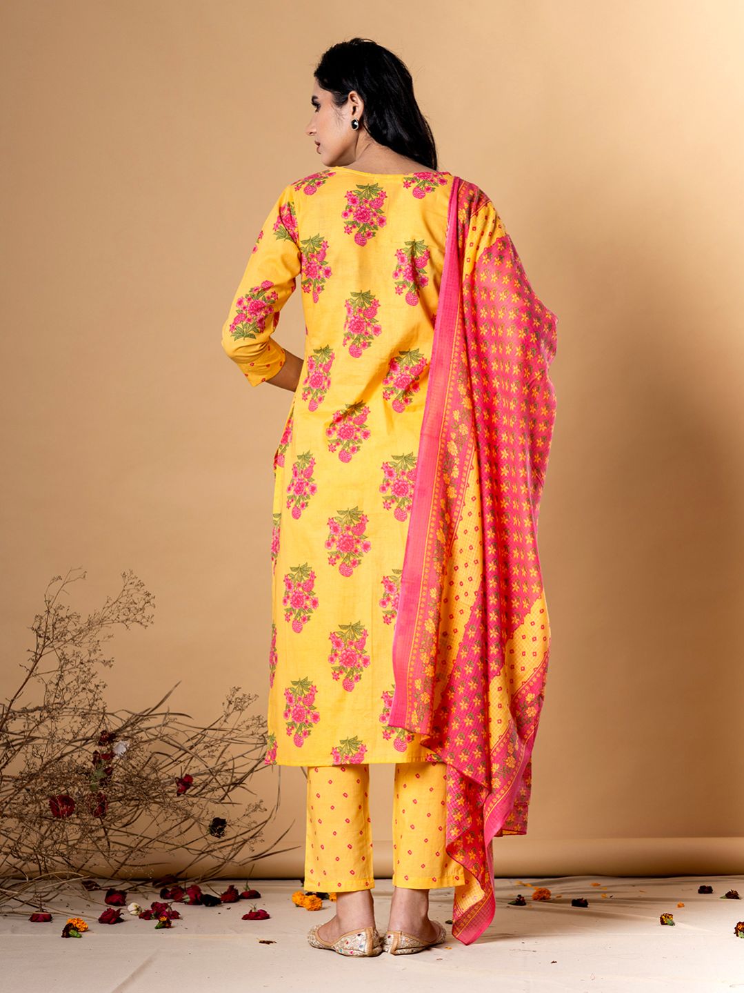 Straight style cotton fabric yellow color kurta and bottom with dupatta