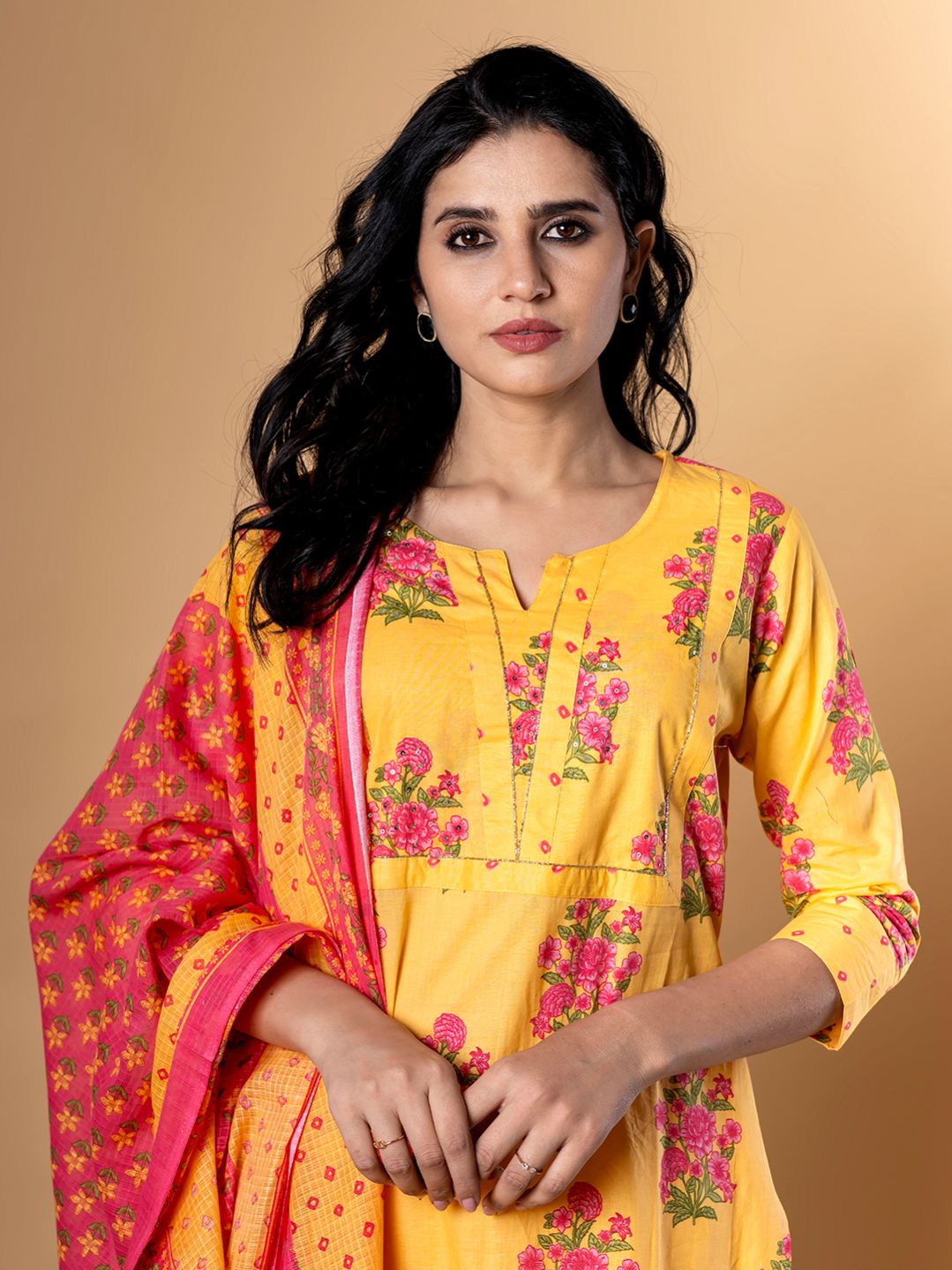 Straight Style Cotton Fabric Yellow Color Cut Dana,Floral Printed Kurti With Palazzo And Dupatta