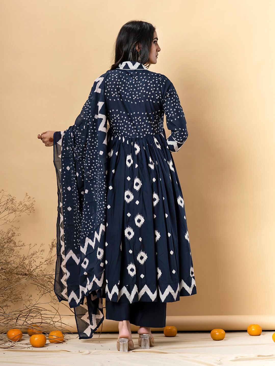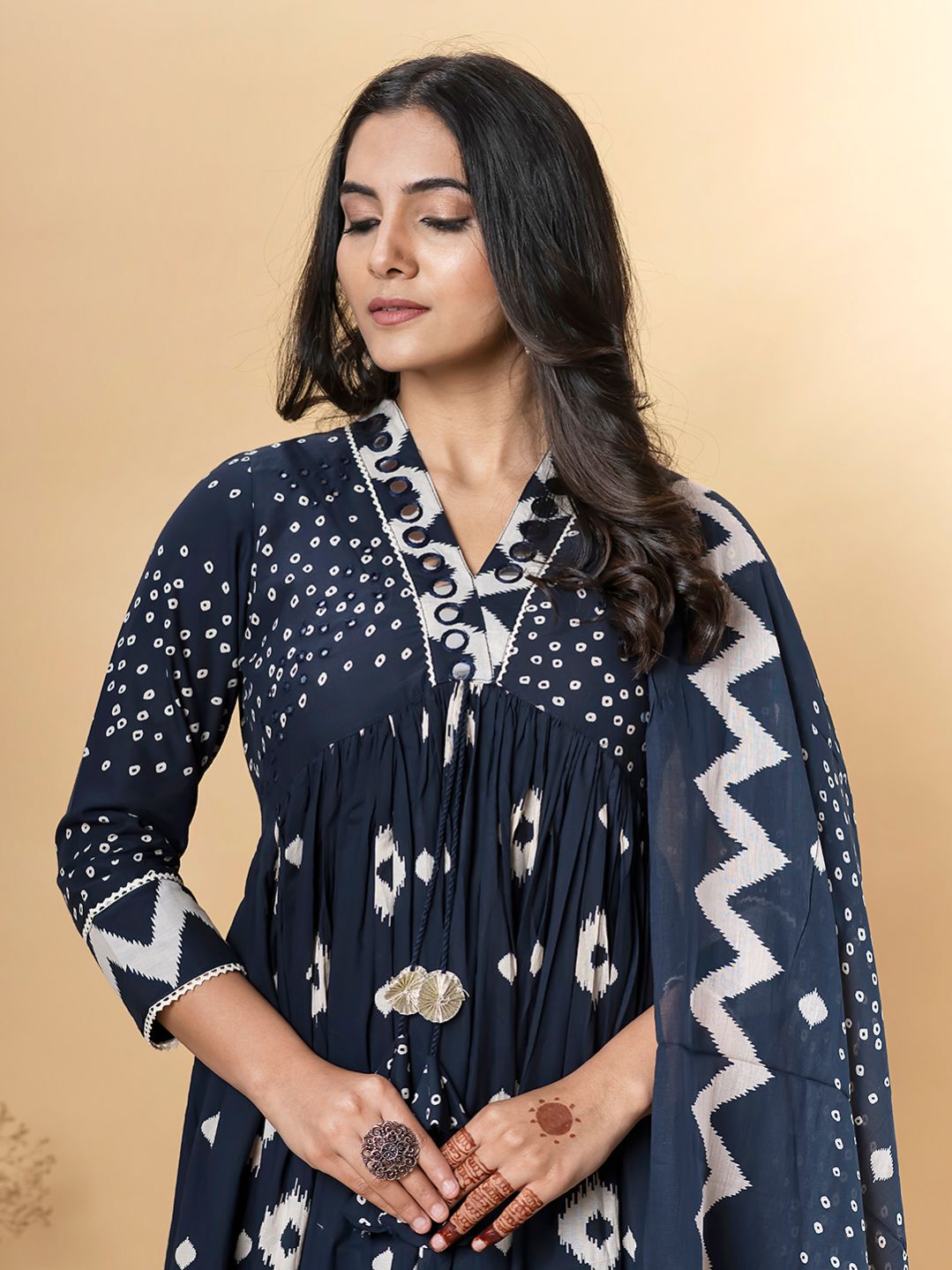 Frock Style Cotton Fabric Navy Blue Color Bandhani Printed Kurti With Palazzo And Dupatta With Mirror Work